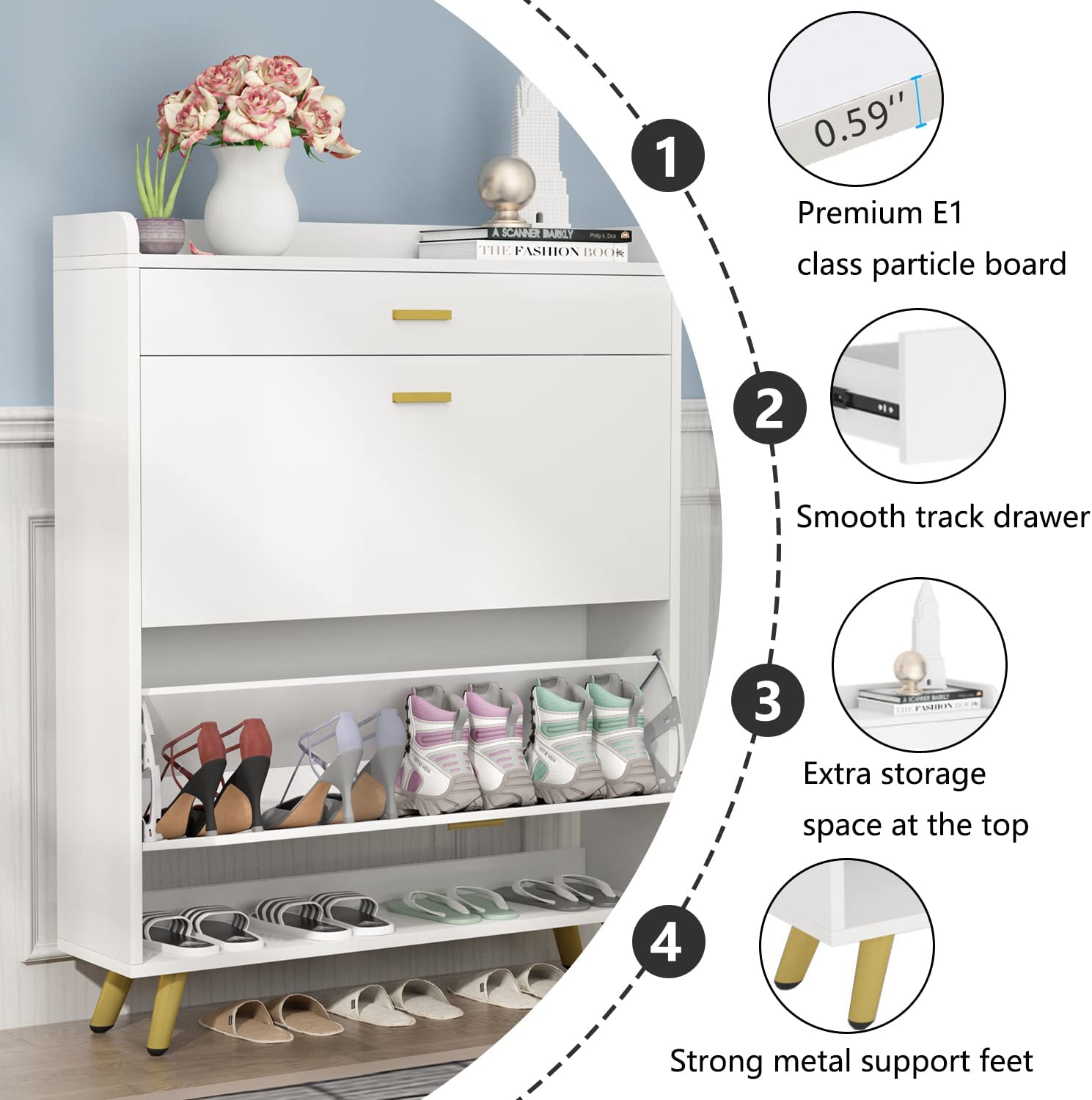 【Strong & Sturdy】 - The shoe storage organizer is made of premium quality manufactured wood. Connotation two fold-out parts are made of iron. The whole shoe cabinet is elegant and sturdy, made to last.
