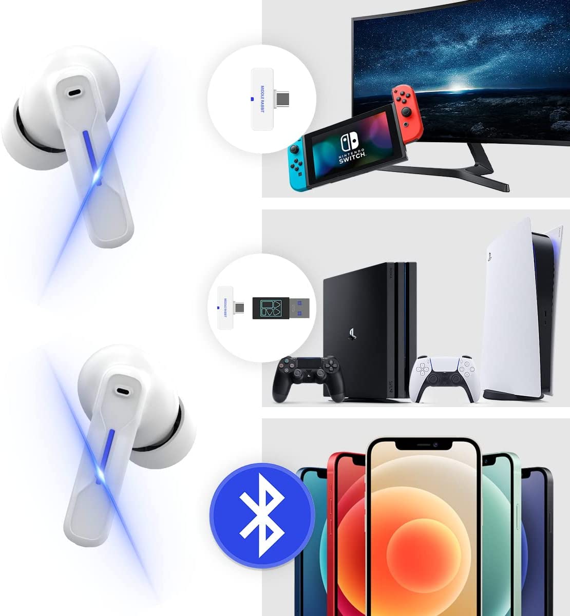 【2.4GHz USB Dongle Connection & Bluetooth Connection (Both Supporting Mic)】 The Middle Rabbit SW4 earbuds support both 2.4G Dongle and Bluetooth connections. This ensures that the earbuds can connect to PCs, PlayStation 4, PS4, PS5, Nintendo Switch, VR, laptops, tablets, mobile phones, iPhones, Android devices, and more.
