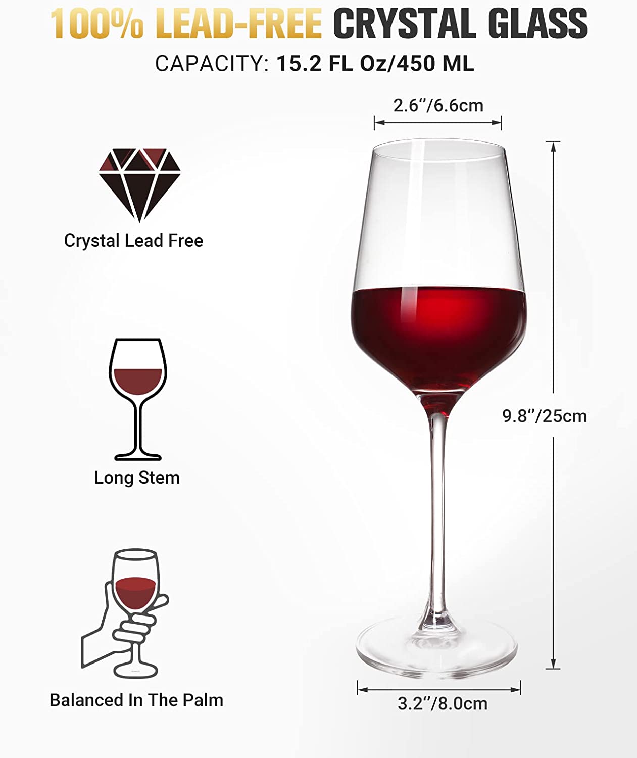 • Premium Lead-Free Crystal Glasses: These wine glasses are equipped with the highest standard of lead-free crystal to ensure health, clarity, durability, hassle-free to drink and share. Dishwasher safe and easy to clean