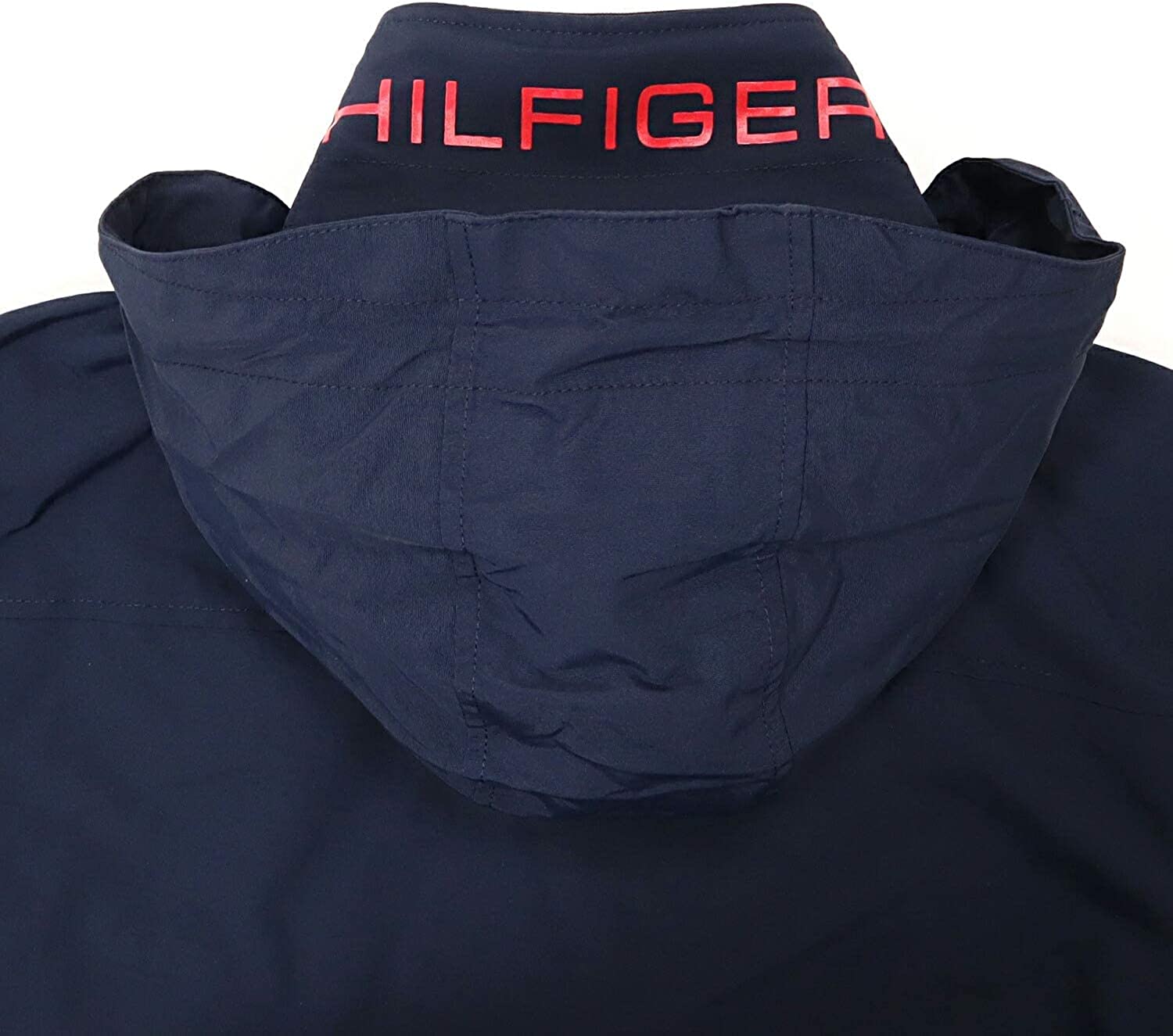 Layer up in this men's jacket from Tommy Hilfiger when the weather calls for added protection. Lightweight and waterproof. Zip front closure. Mock collar with packable hood. Slight waist open pockets; interior pocket with hook-and-loop closure.