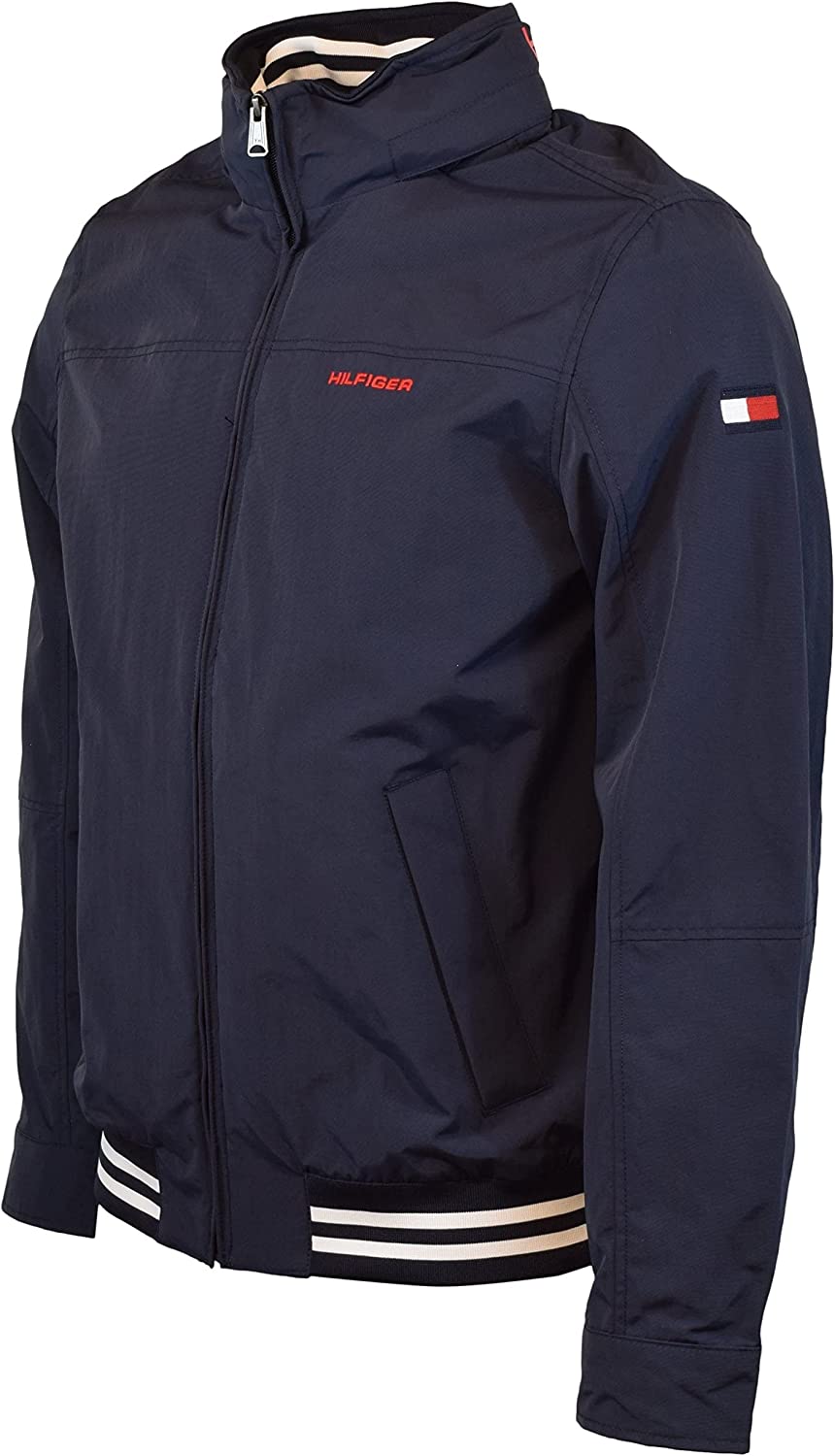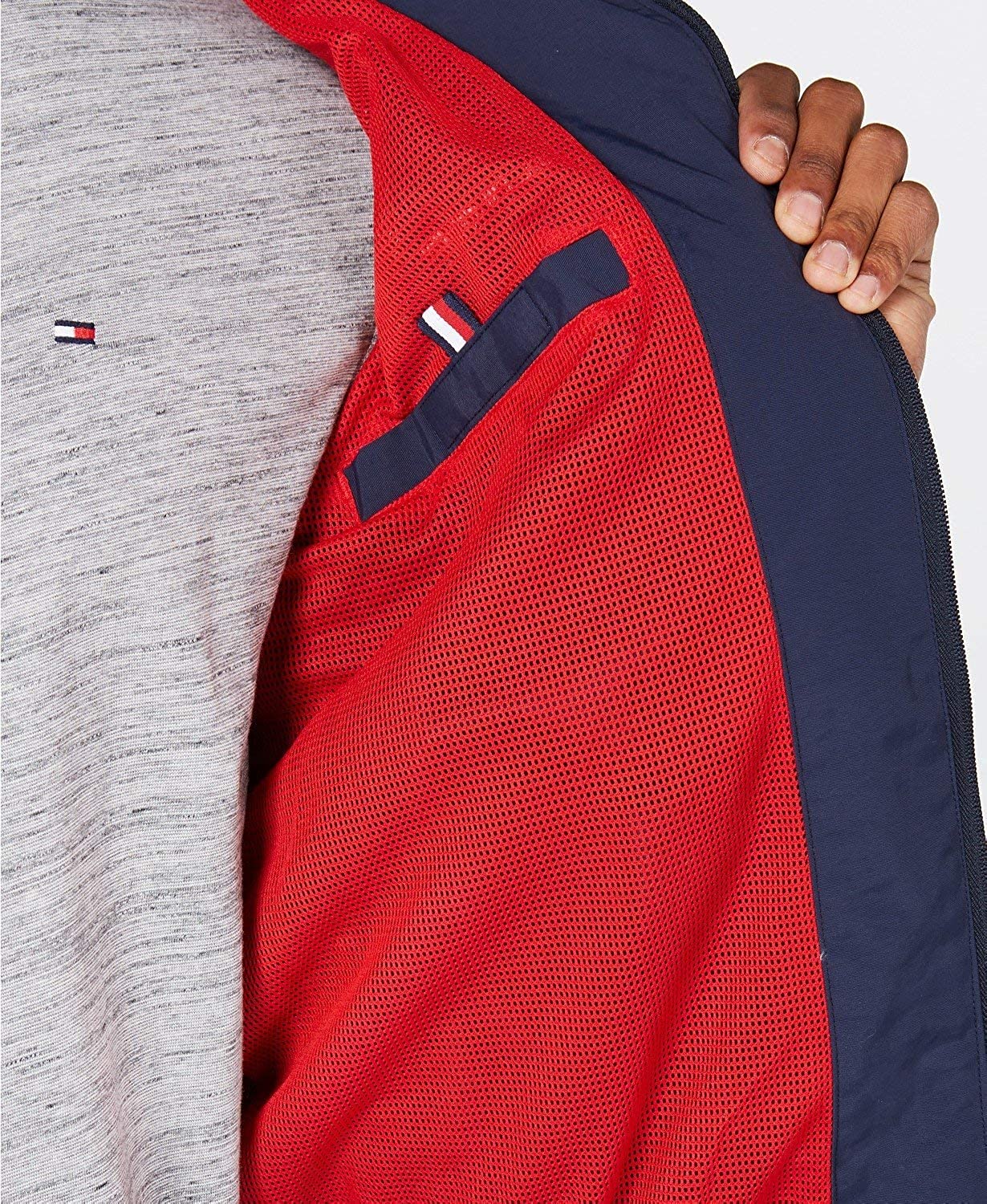 MADE FOR THE RAIN: Tommy Hilfiger’s waterproof mens bomber jacket features a lightweight, water-resistant nylon shell to keep you dry without the weight, while the protective packable hood can be tucked away into the collar on sunnier days.