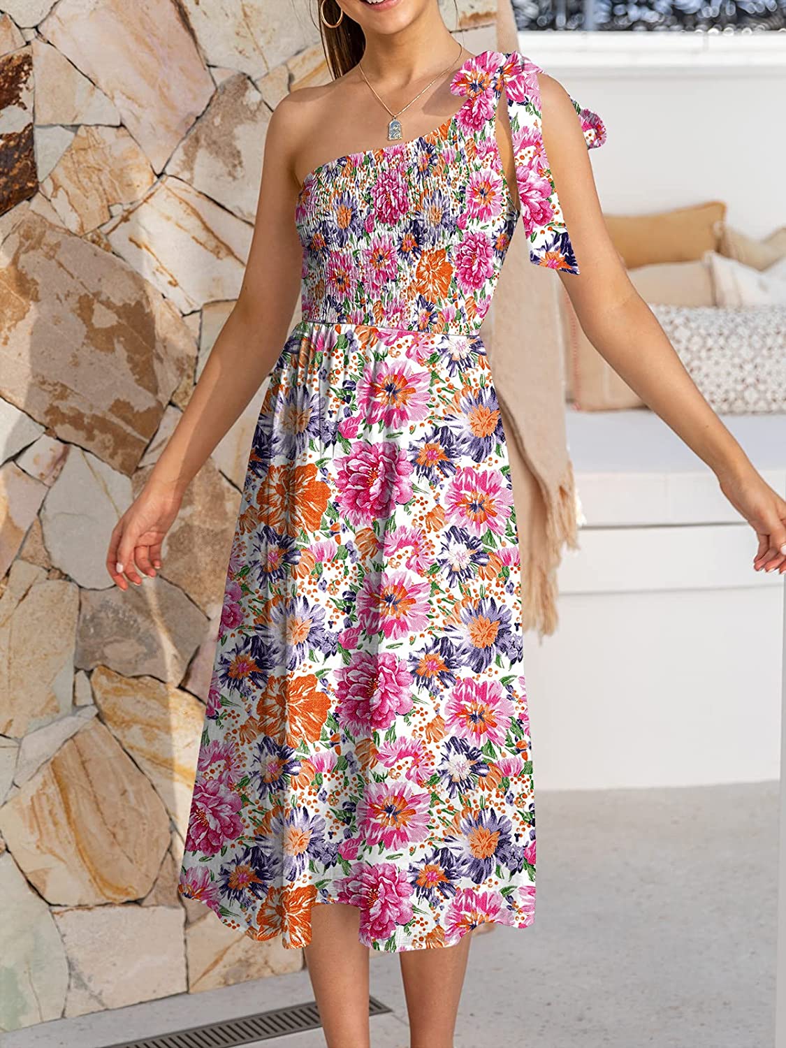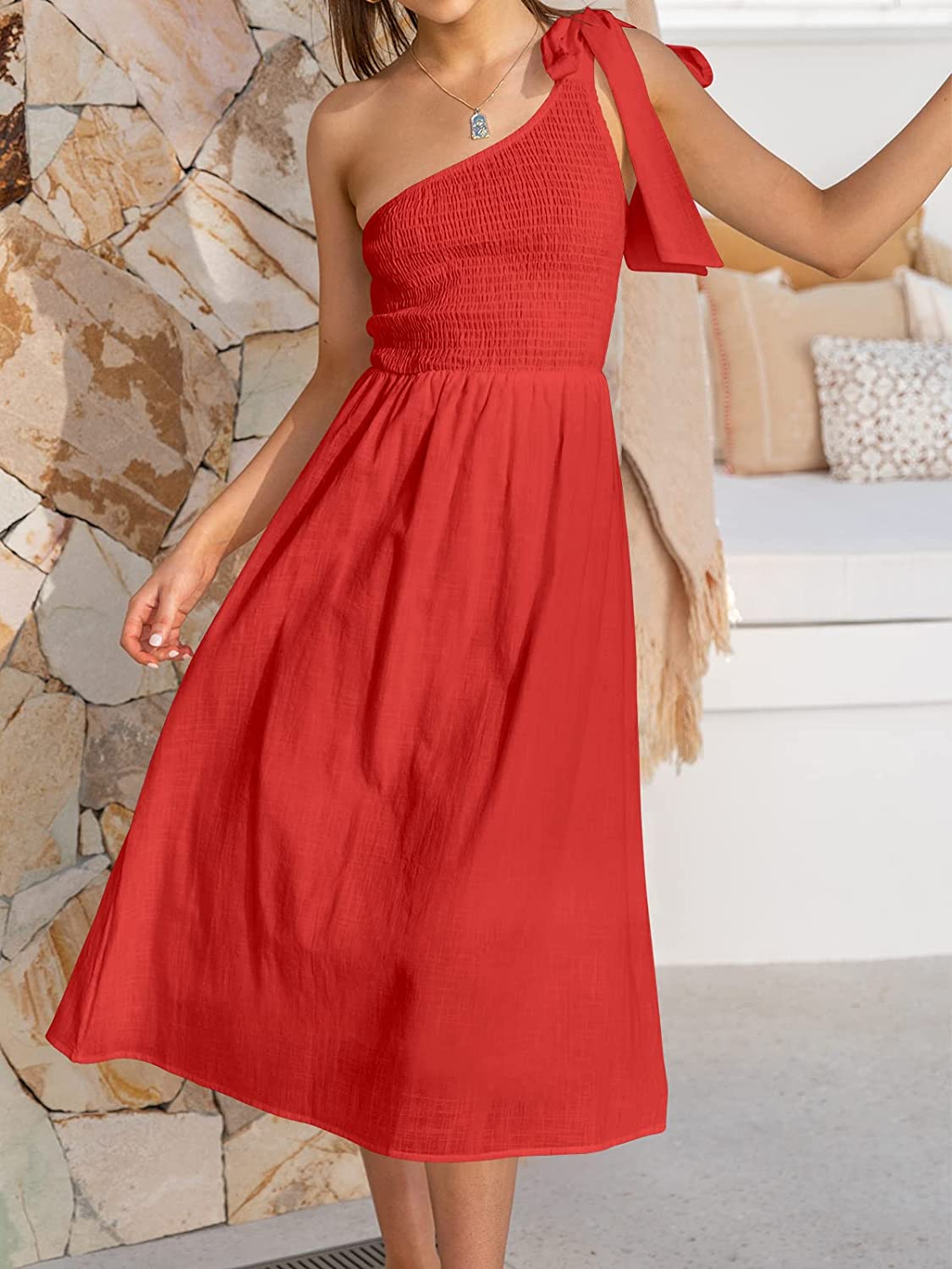 Features - Sleeveless summer dress,Solid color,floral print more than 10 colors. One shoulder,tie knot on shoulder,shirred bodice and midi skirt,Summer beach party dress,super cute flowy long dress.