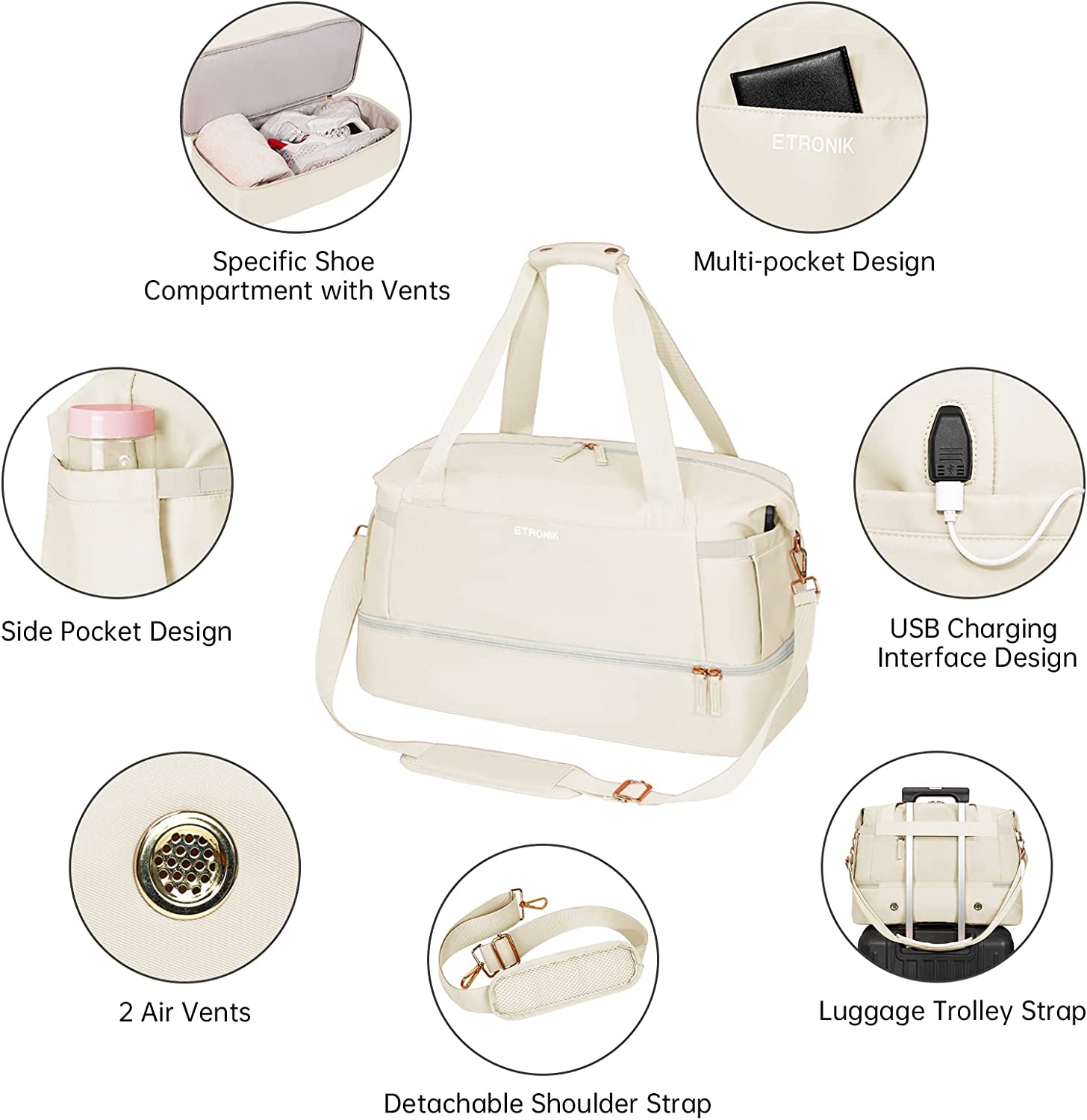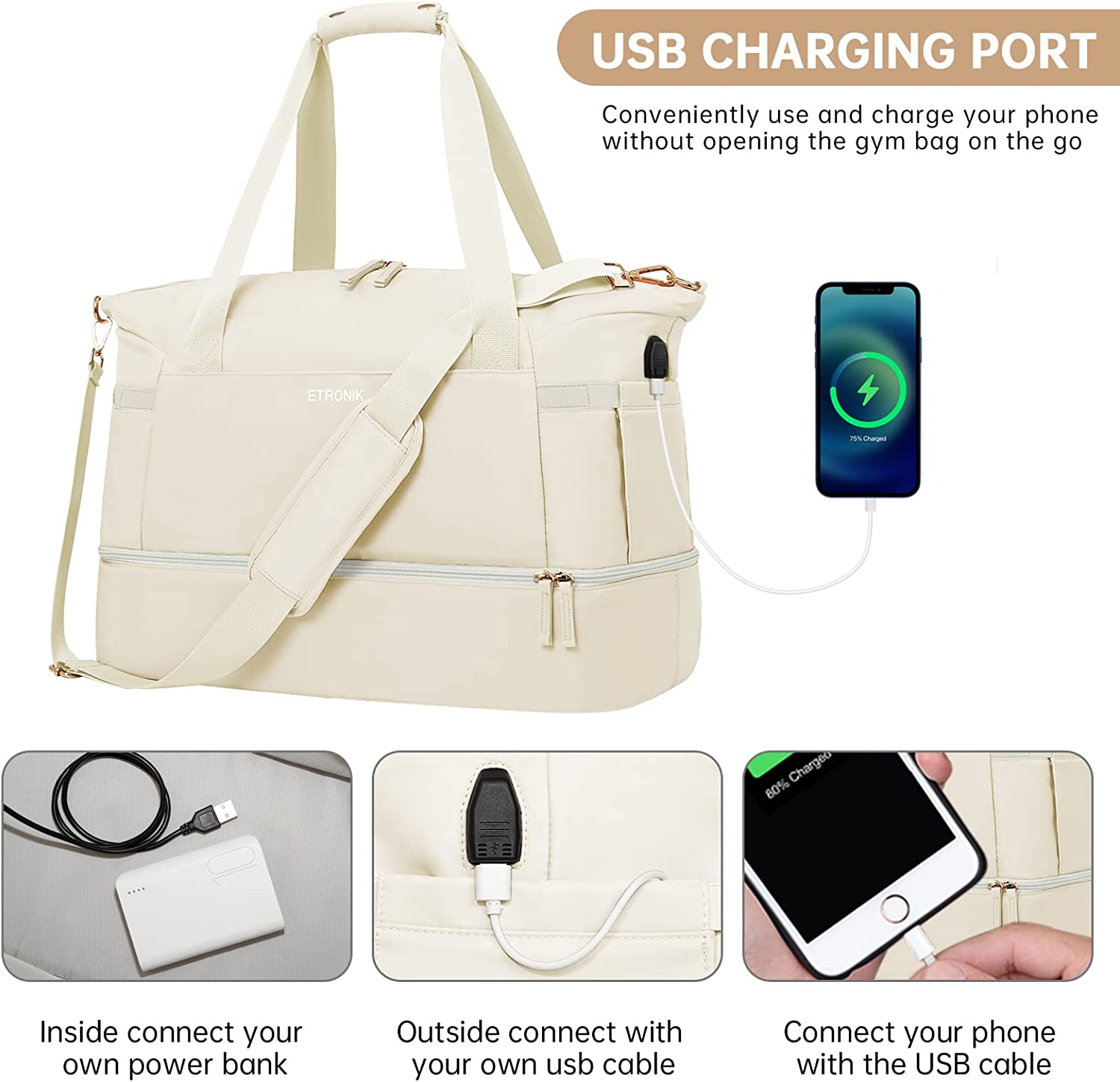 Gym Bag for Women, Sports Travel Duffel Bag with USB Charging Port, Weekender Overnight Bag with Wet Pocket and Shoes Compartment for Women Girls Travel, Gym, Yoga, School (Off White)