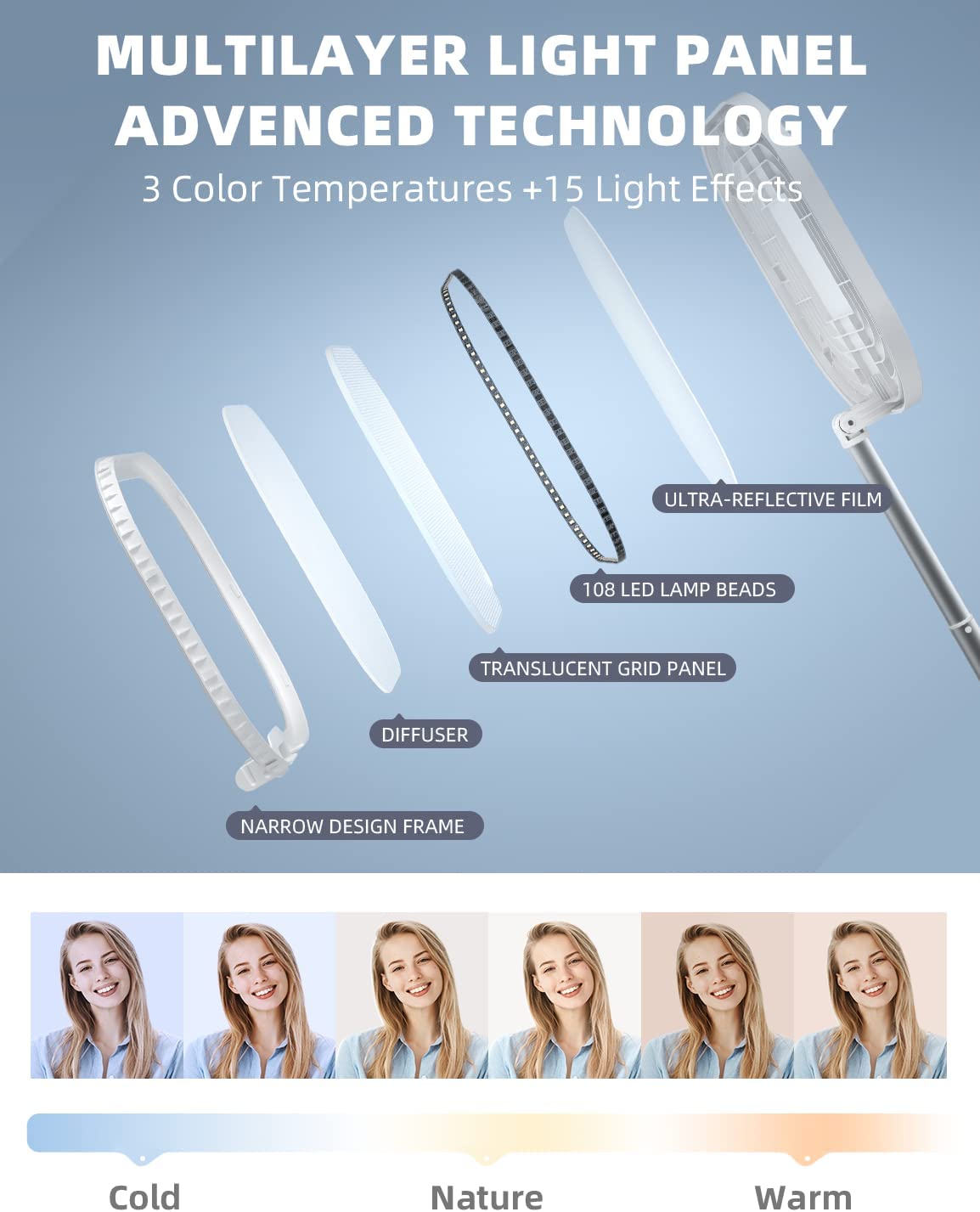 [Innovative Fill Light] The foldable selfie stand has 3 color lighting modes (Cold/Natural/Warm) and 5 brightness levels for each. It's convenient to controlled it via a remote shutter or product's switch control button. Innovative multi-light panels side lighting technology make it different from other ring lights, more natural and soft for making photos or videos.Great for dirferent scenes.