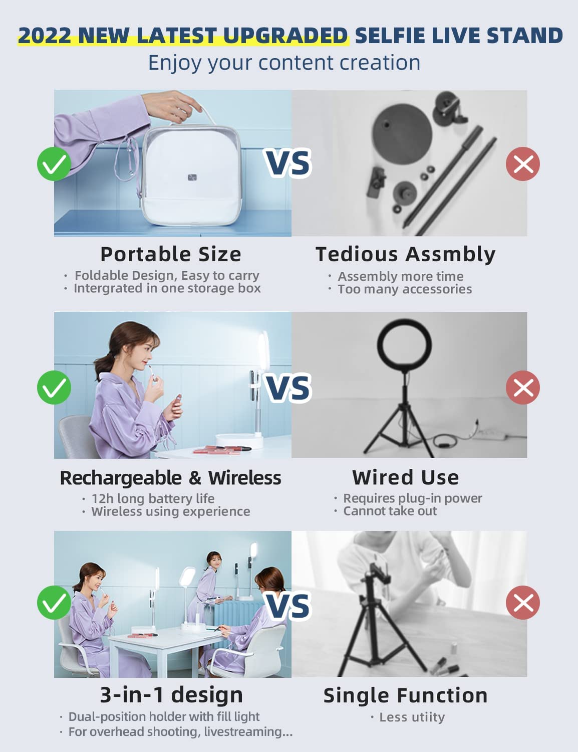 [More Applications&What's included] Great for make up, selfie, TikTok /YouTube/ins video recording, live streaming, Facetime, Zoom Meetings, Vlogs/Bolgs, Video Calls, online tutorial, create content , as a desktop lamp for reading book etc. What's in the box:1 X Foldable Stand, 2X phone holder, 1 X Cable,1X Remote Control Shutter,1 X User Manual.