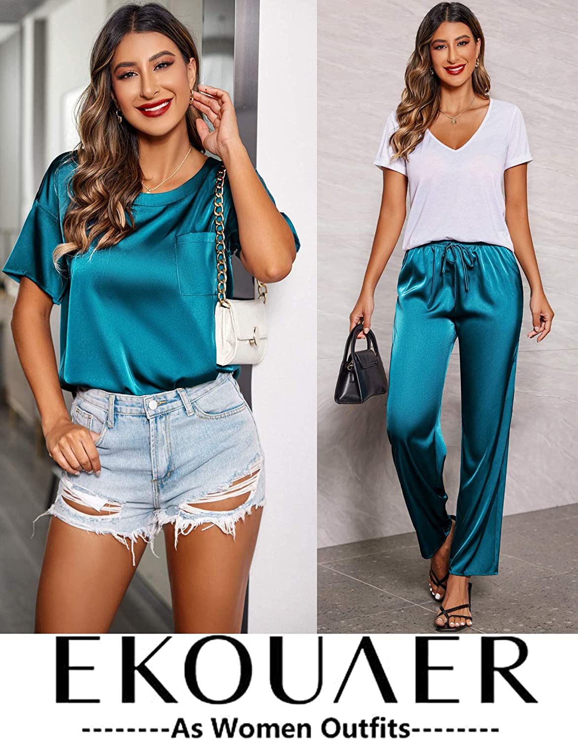 Ekouaer?Womens?Satin?Silky?Pajama?Set?Short?Sleeve?Shirt?with?Long?Pajama?Pant?Set?Soft?PJ?Loungewear