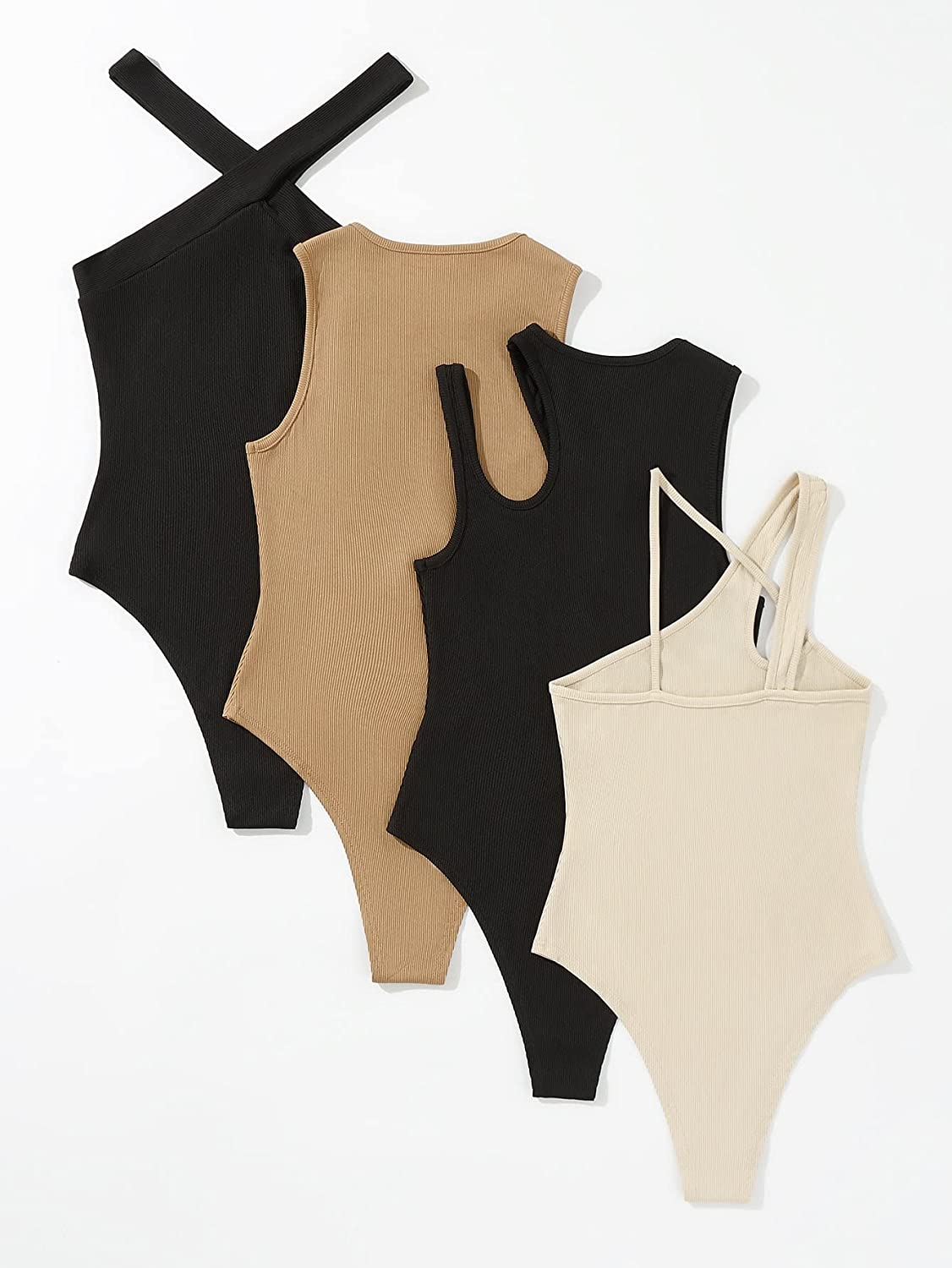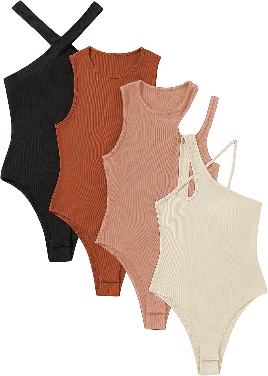 MakeMeChic Women's 4pcs Casual Solid Sleevelss Ribbed Knit Bodysuit Pack