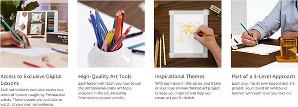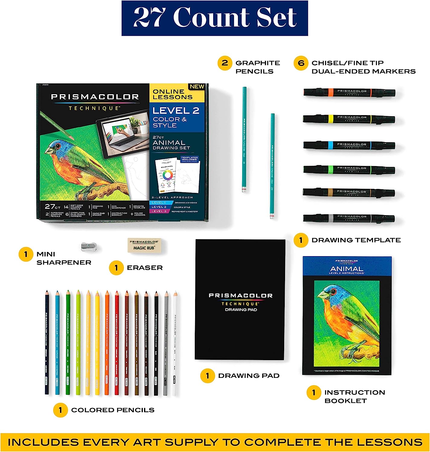 Learn art at your own pace from the comfort of home with Prismacolor Technique. Each Prismacolor Technique set features a unique coupon code for access to digital art lessons you can’t get anywhere else. Instructed by Prismacolor artists, each lesson will teach you how to use the professional-grade art supplies included in the set to create a piece of art you will cherish. The Level 2 Animal Drawing Set is designed for those who want to keep building on their art knowledge. You’ll practice color usage and style while creating a vibrant bird drawing. The set features Prismacolor colored pencils with rich cores for smooth color laydown and dual-ended markers that let you switch between broad coverage and fine lines. You’ll also receive an eraser, a drawing pad, graphite pencils, a mini sharpener, a drawing template, a set of instructions, and hours of online content to learn at your convenience!
