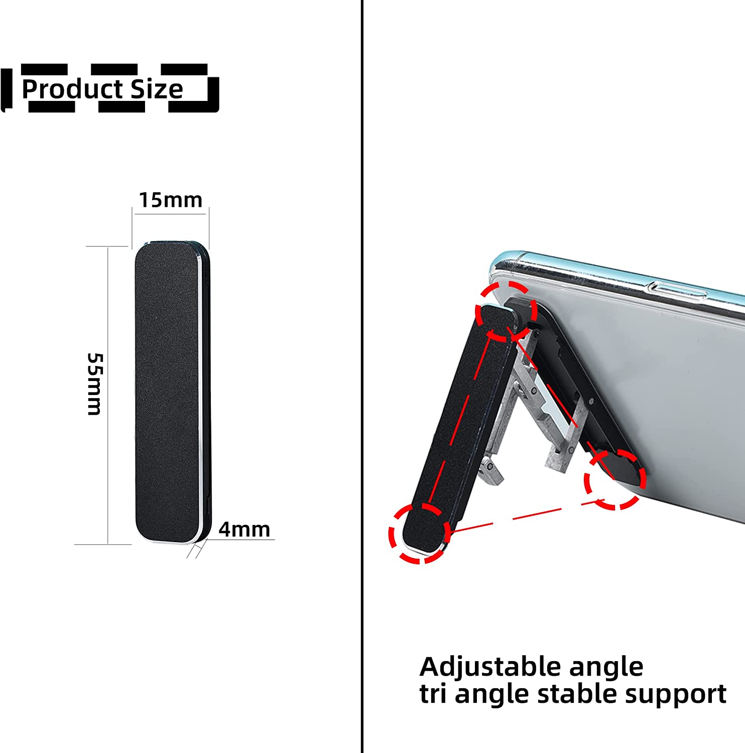 Simple Installation - Make sure the surface area is flat, not curved. Be sure to clean and dry the surface area. Easily peel off the 3M protective glue and place the stand anywhere you want. There are 2 easy ways: 1. On the back of the phone or in the middle. 2. At the bottom or middle of the phone case