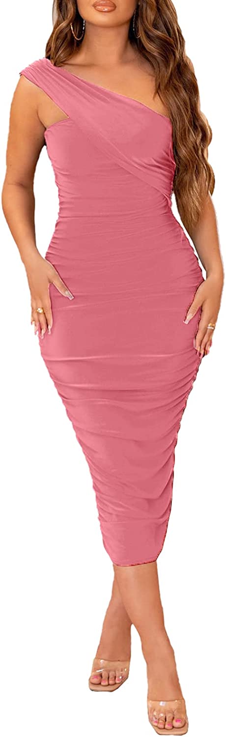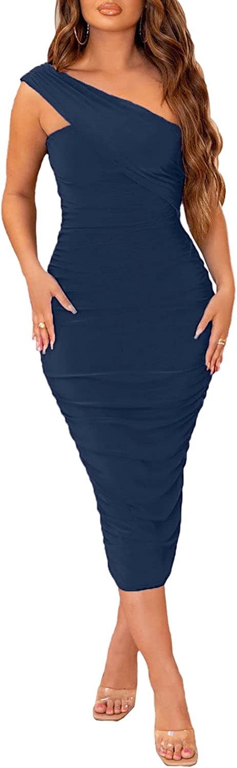 Feature: Sleeveless, adjustable one shoulder/off shoulder, ruched back, slim fitting, midi length, solid color, suitable for most body shape, make you looks more sexy and elegant