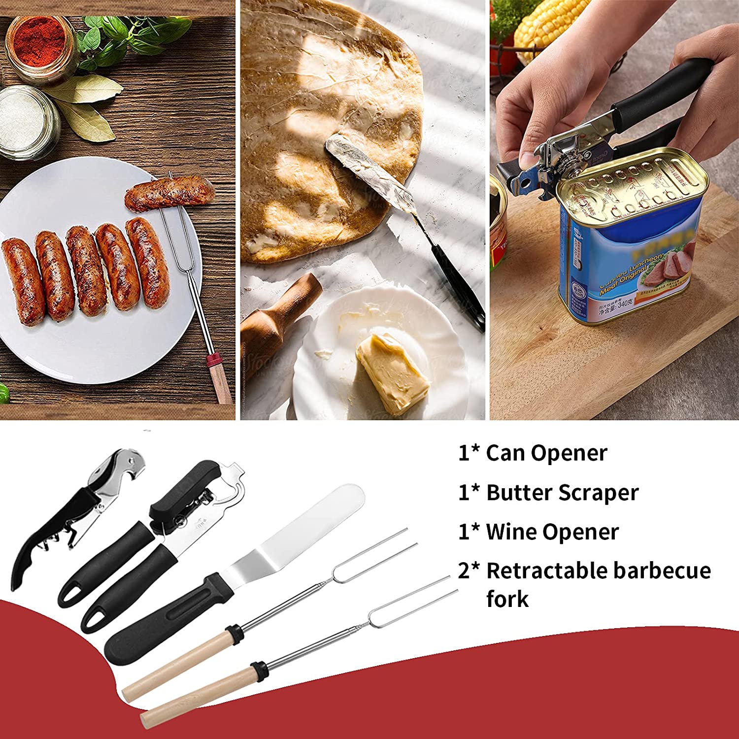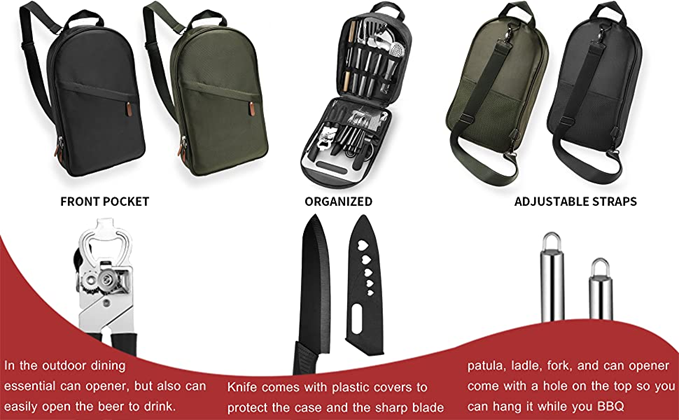 | Included Components | 1*storage bag, 1*cutting board, 1*barbecue fork, 1*slotted tongs, 1*paring knife, 1*chef's knife, 1*wine opener, 1*can opener, 1*ladle, 1*scissors, 1*scraper, 1*slotted turner, 2*barbecue skewers, 2*extendable BBQ forks, 4*flatware cutlery set(3pcs), bag. |