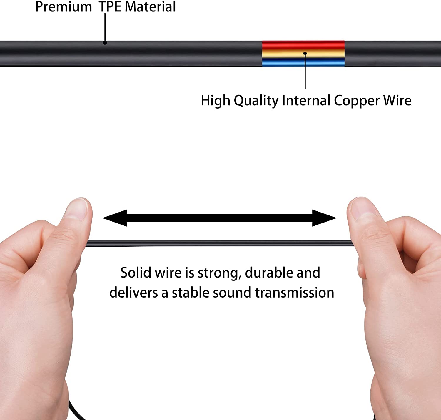 4 feet long tangle-free cord is made of premium TPE material that is strong, sturdy and durable. It is lightweight and portable, great for the gym, running, exercise and sweat resistant. Use everyday while commuting or traveling.