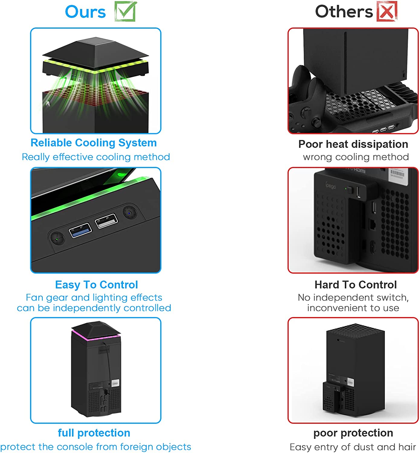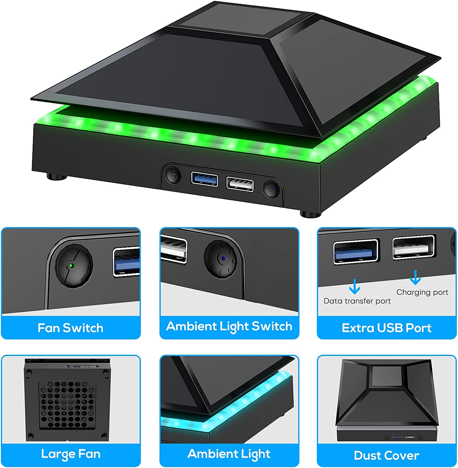 【Necessary for Xbox Series X】---- This product integrates many functions, such as top cooling fan, dust-proof, color light strip, USB interface for data transmission and USB interface for charging. It helps to prevent for your Xbox Series X console from over-heating and dust to extend the life of your Xbox Series.At the same time, the color light increases the atmosphere of the games.(NOTE:When the console of xbox series x is working, the dust cover of the fan can be removed to speed up the heat dissipation effect. Alige the two holes under the dust cover first, then cover the dust cover.)