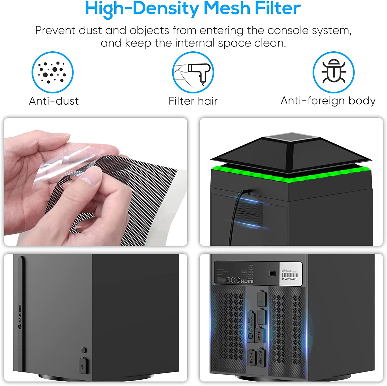 【Dust Cover Filter】---- The cooling top bracket of Xbox seris X supports top dust proof,At the same time, the product contains 2 sets * dust cover compatible with Xbox Series X, 1 set * silicone dust plugs,which have accurate size and easy to install and replace without additional tools. Prevent dust from entering the USB and HDMI ports for Xbox Series X, extend the life of your console.