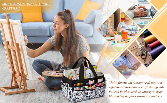 1. MULTI-PURPOSE - Wide open design with multiple Pockets around this canvas art craft caddy allows it suitable for scrapbook storage,Art &Craft,sewing tools,teaching staff,office supplies,make-up,etc.Moreover,An additional solid PP board in the bottom makes the craft storage bag good in shape and stable in structure.