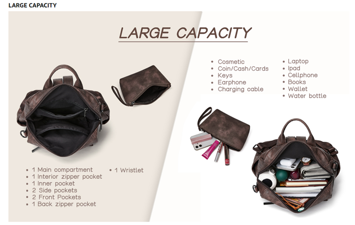 【DIMENSION & LARGE CAPACITY】 Backpack: (L) 12x (W) 5.5x (H) 14 inches. Wristlet: (L) 7 x (H) 5.25 inches. This backpack has many pockets, 2 on the front, 2 on each side, 2 inside, and it includs a security pocket on the back so there are no concerns about valuables being stolen from behind. The cute wristlet provids more room to organize your essentials.