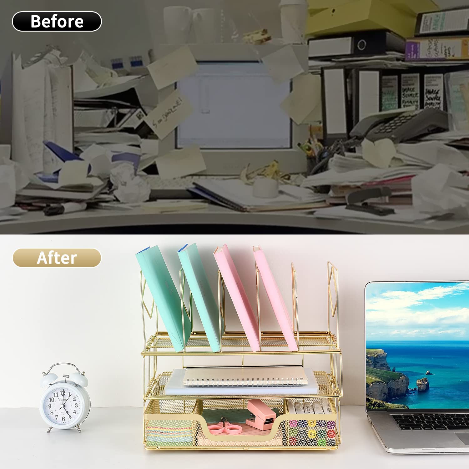 ?【EASY ACCESS】: The office organizer has 2 Letter Tray + 5 Upright Sections + 1 Sliding Drawer, which makes full use of your vertical and horizontal space, helps you quickly identify the contents of each compartment, and greatly improves your work efficiency.