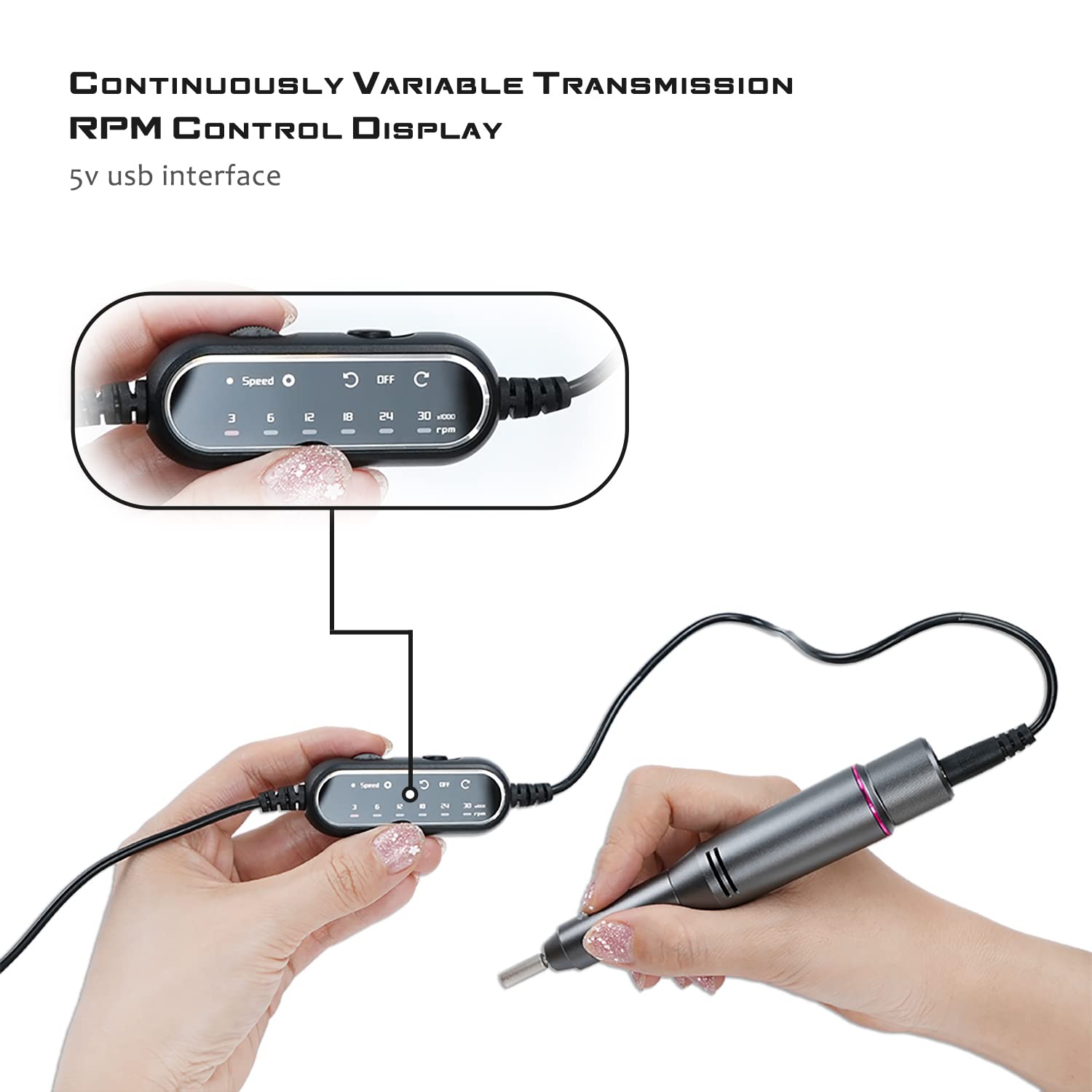 Fuegobird Electric Nail Drill Kit, Portable USB Nail File Tool for Acrylic Gel Nails, Professional Manicure Pedicure Efile Machine for Home and Salon, 30000 RPM with LCD Display Control