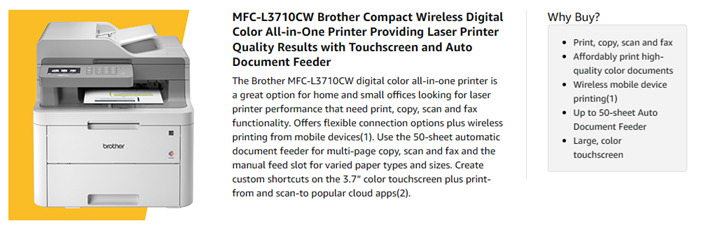 The reliable, robust Brother MFC L3710CW compact digital color all in one printer is a great choice for the busy home or small office looking for laser printer performance. Affordably add color to your printing for vivid images on all your documents. Quick print speeds of up to 19ppm, scan speeds up to 29ipm black and 22ipm color plus robust construction ensures your all in one works as hard as you do. The compact design is ideal for smaller spaces.The MFC L3710CW helps make color printing affordable for your home or small office looking for laser printer quality. Toner Save Mode helps you save on toner costs. With Brother affordable increased yield toner options, there’s never been a better time to add a Brother digital color printer to your home or small office. Choose from Standard or High Yield toner to help make color printing even more economical.Flexible paper handling options accommodate a variety of paper types, sizes and styles. The up to 250 sheet capacity adjustable paper tray lets you print longer with less refills and handles letter or legal size paper while the up to 50 sheet automatic document feeder helps you save time with easy multi page copy, scan and fax. The manual feed slot accommodates printing on card stock, envelopes, photo paper and more.The Brother MFC L3710CW offers versatile connection options with built in wireless and Wi Fi Direct or connect locally to a single computer via USB interface. Print wirelessly from your desktop, laptop, smartphone or tablet.(1) Print from and scan to popular cloud apps(2) directly from the 3.7"" color touchscreen including Dropbox, Google Drive, Evernote, OneNote and more. Help save time by creating custom shortcuts on the touchscreen for your most used features. The Brother MFC L3710CW compact digital color all in one printer has a one year limited warranty .(1)Requires connection to a wireless network. (2)Requires an Internet connection and an account with desired service. (3)Approximate cartridge yield in accordance with ISO/IEC 19798 (letter/A4). (4)Reprinted from pcmag with permission. 2017 Ziff Davis. All Rights Reserved. (5)The mobile device must have NFC capability and run Android OS 4.4 or later. (6)Requires additional purchase. (7)Approximate 18,000 page yield each drum unit (may vary by type of use). (8)The recommended range of monthly printed pages to achieve the best possible performance and printer life. Printers are intended to handle occasional usage beyond this range with little or no effect. Consistently printing above the recommended print volume, however, may adversely affect the print quality or life of the machine. It is always best to choose a printer with an appropriate recommended print volume to allow for any anticipated increase in printing needs.