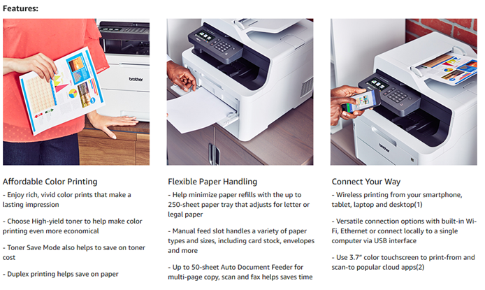 The Brother MFC L3750CDW offers versatile connection options with built in wireless, Ethernet and Wi Fi Direct or connect locally to a single computer via USB interface. Print wirelessly from your desktop, laptop, smartphone or tablet.(1) Print from and scan to popular cloud apps(2) directly from the 3.7" color touchscreen including Dropbox, Google Drive, Evernote, OneNote and more. Help save time by creating custom shortcuts on the touchscreen for your most used features. The Brother MFC L3750CDW compact digital color all in one printer has a one year limited warranty with free online, call, or live chat support for the life of your printer.