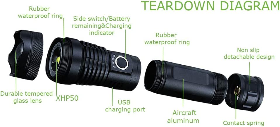 | Specific Uses | ● Long Range, ● Adjustable Light Modes, ● High Power, ● Adjustable Focus, ● Rechargeable, ● Impact Resistant |
