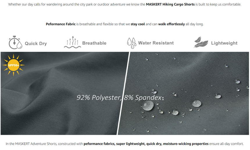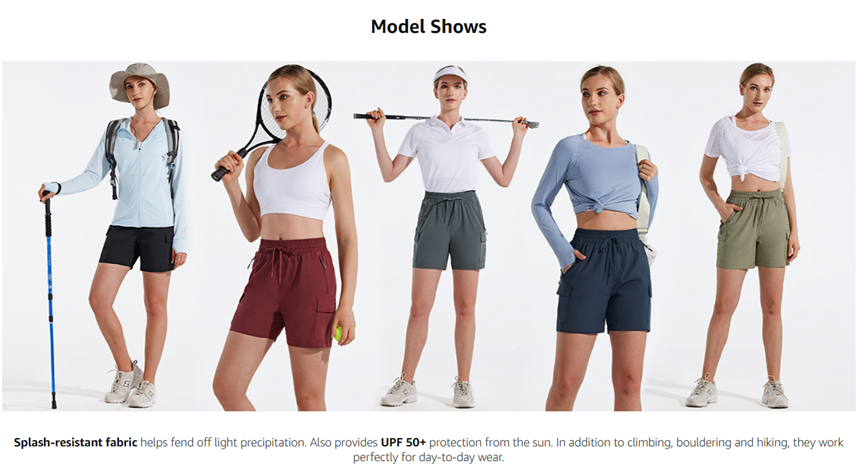• Advanced Technology ---- The womens hiking shorts made of lightweight, quick dry, breathable and water-resistant fabric wicks moisture to keep your skin cool and fresh all day.