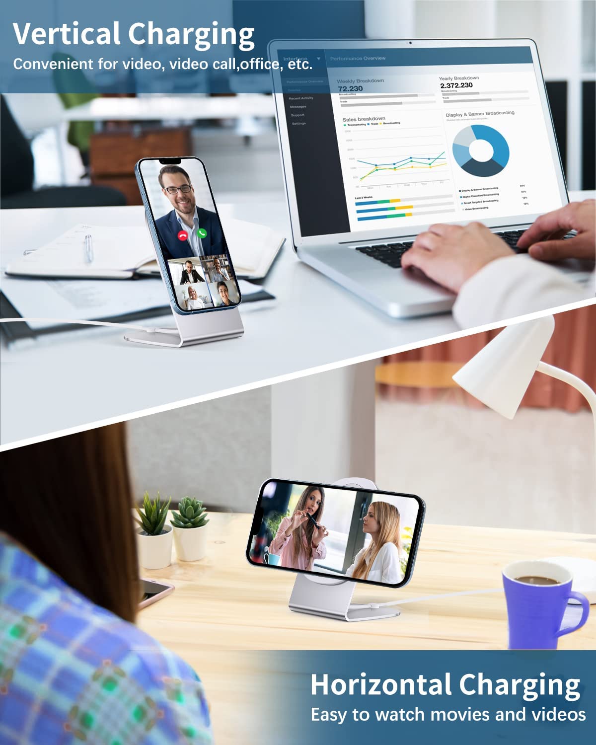 - Suitable Angle and Position: The charging stand can support your iPhone 360° rotating horizontal and vertical viewing angle as you like.