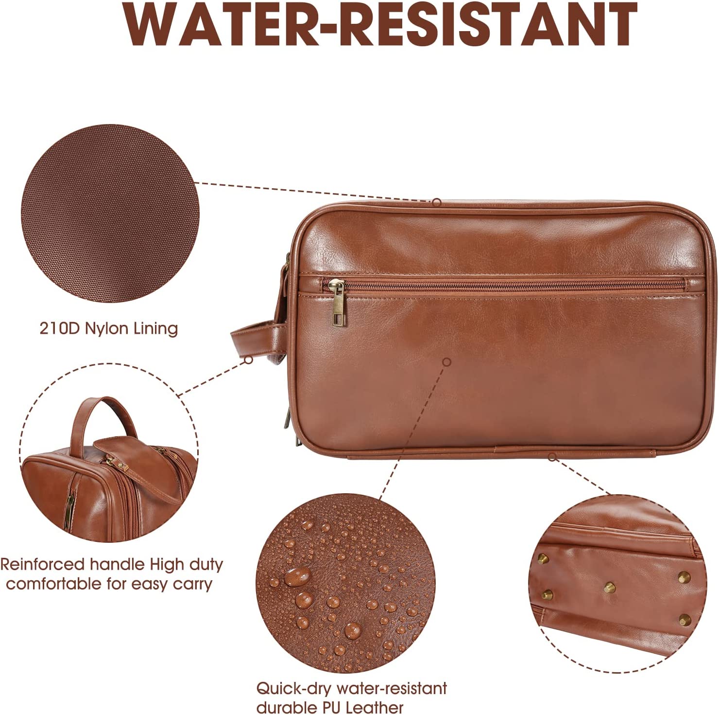 HANDMADE TO DURABLE: A travel toiletry bag that removes all your worries, crafted from eco-leather with a glossy finish, sturdy zipper and a padded, quick-drying, moisture-wicking lining. The waterproof toiletry bag and bathroom shaving bag are easy to wipe clean, the main compartment has a leak-proof lining to prevent liquid spills, the soft yet strong waterproof material helps the leather wash bag resist common bathroom spills, making it a Your reliable travel and home companion.