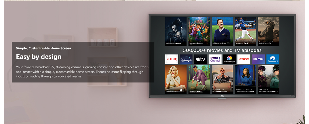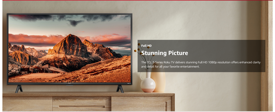The TCL 3-Series is the simply smart way to enjoy endless entertainment. Enjoy over half a million movies and TV episodes available to stream plus sports, news, music, kids and family, food, science and tech, fitness, foreign language and so much more. Start streaming free TV right from your home screen or browse 250+ free live channels with the Live TV Channel Guide to find what to watch next. Your favorite broadcast TV, streaming channels, gaming console and other devices are front-and-center within a simple, customizable home screen. There’s no more flipping through inputs or wading through complicated menus. The super-simple remote—with about half the number of buttons on a traditional TV remote—puts you in control of your favorite entertainment and includes one-touch shortcuts to popular channels like Netflix.