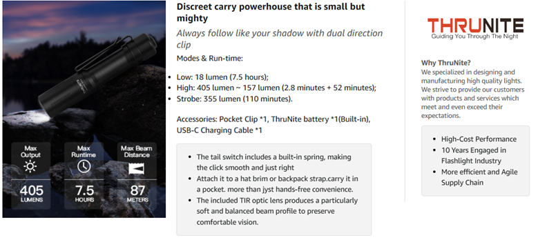 | Included Components | ThruNite battery *1(Built-in), USB-C Charging Cable *1, Pocket clip *1 |