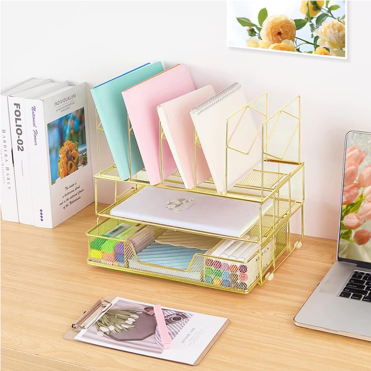 Youbetia Desk Organizers and Accessories - Double Tray and 5 Upright Sections, Office Supplies Desk Organizer with Drawer, File Office Organization with Binder Clips, Gold