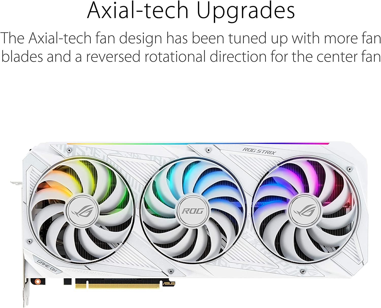 The ROG STRIX GeForce RTX™ 3090 White OC Edition 24GB GDDR6X adds to the NVIDA Ampere Architecture with a white color scheme, Axial-tech fan design, 0dB technology, 2.9-slot Design, Dual BIOS, Auto-Extreme Technology, SAP II, MaxContact Technology, and more.