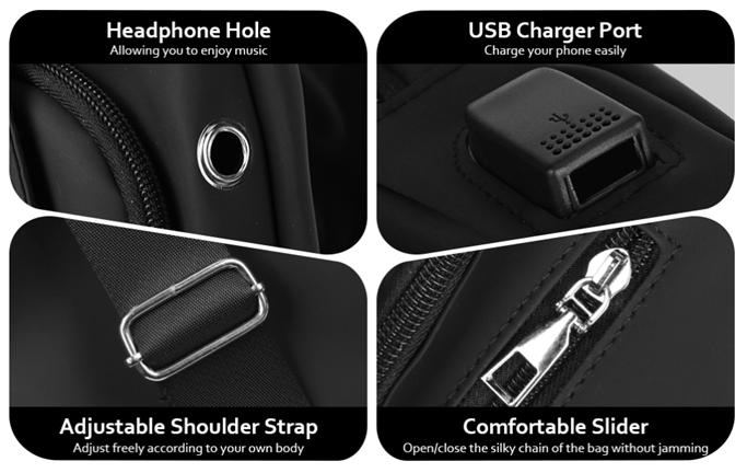 USB Charger Port & Headphone Hole: Cross body bag with USB Charging Port & Headphone Hole(without portable charger),You may charge your mobile phone easily with the USB charing port (using the implanted USB cable connect your potable power supply). A Mobile Phone Pocket in shoulder strap makes you convenient for charging and listening while walking.