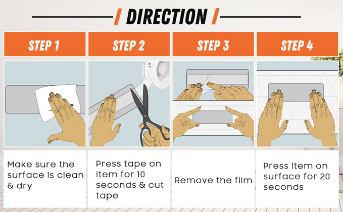 Note3: Please keep the mounting surface dry, clean and free of oil when mounting to creat a instant and permanent bond . Applying the tape vetically on the items can creat stronger bonds.