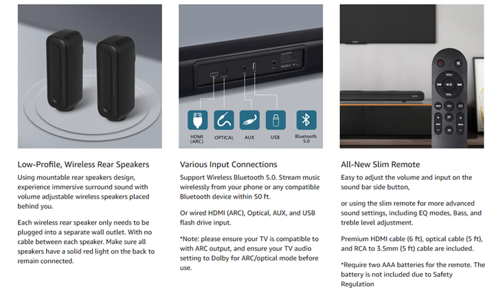 - 5.1-CHANNEL SURROUND SOUND EXPERIENCE - Fully enjoys the thrill of DOLBY DIGITAL PLUS with the newest 5.1 Surround sound Engine, DSP technology, and impressive 400W of total system power. Dolby Audio adds room-filling excitement with floor to ceiling virtualized surround sound experience. Immerse yourself with 360° room transforming sound that adapts to your environment with included wireless rear speakers, taking TV, movies, and music into a whole new dimension.