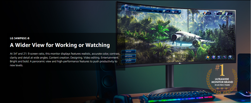 With a wider view for working or watching, push your productivity with the #1 UltraWide Monitor brand in the U.S.* At 34 inches with a 21: 9 screen ratio, this curved QHD (3440x1440) VA Display features realistic, accurate color, contrast, clarity, and detail at wide angles. Content creation. Designing. Video editing. Entertainment. Bright and bold. The sRGB 99% Color Gamut coverage with HDR 10 brings work and virtual worlds to life, backed by 400 nits of brightness. This display tech elevates textures, elements, character movements and natural light and shadow. This UltraWide monitor features a 3-Side Virtually Borderless Display that’s has a tilt and height adjustable Stand. Whatever the task, our LG UltraWide Monitor unveils a panoramic view and high-performance features to push productivity to new levels. *Source: The NPD Group, Inc., U.S. Retail Tracking Service, Monitors, Aspect ratio: 21:9, Based on Dollars & Units, Feb. 2020- Jan. 2021 and same months ending 2020, 2019, 2018.