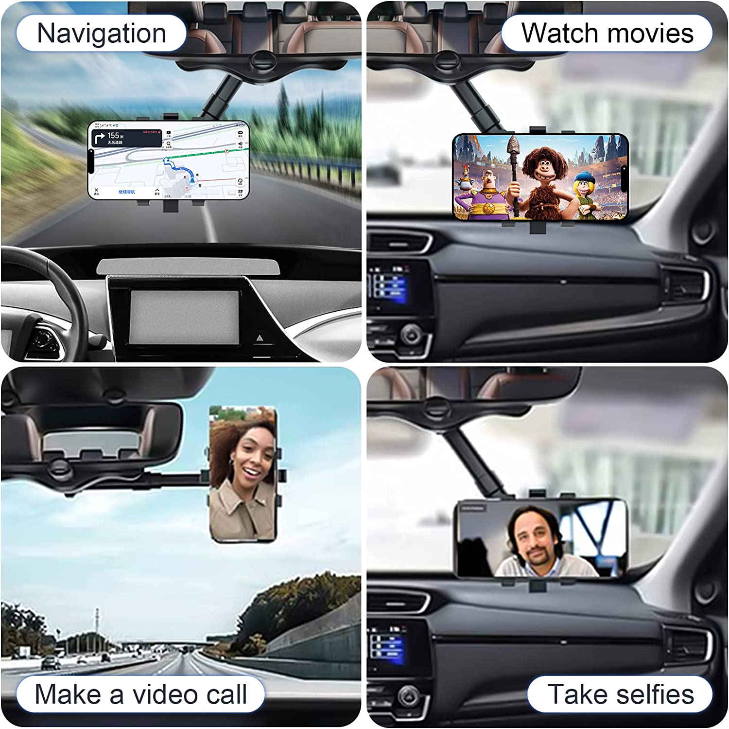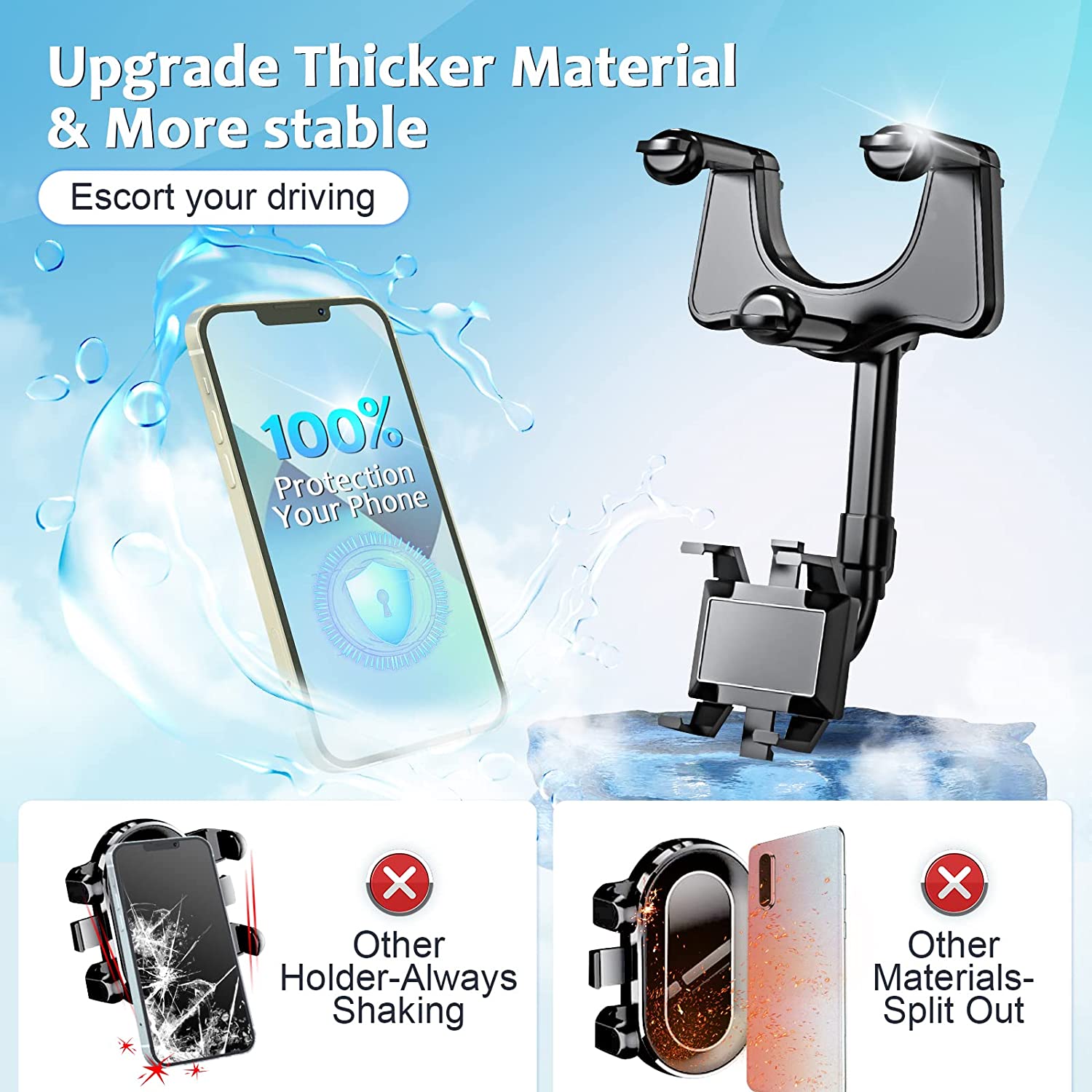 ROBUST AND DURABLE: The four-claw design of our rearview mirror accessories can firmly fix the phone in place no matter how rough the road is. Suitable for all mobile phones and all models.