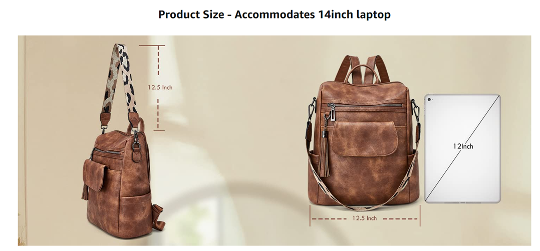 • 【DIMENSION】 Backpack: (L) 12.50 x (W) 6 x (H) 13 inches. Wristlet: (L) 8.75 x (H) 6 inches. Adjustable back straps: 35.55"(longest size). Detachable shoulder strap: 12.50". You can easily fit a 14-inch laptop, office papers, cell phones, water bottles, clothes and your daily items into this women's backpack purse.