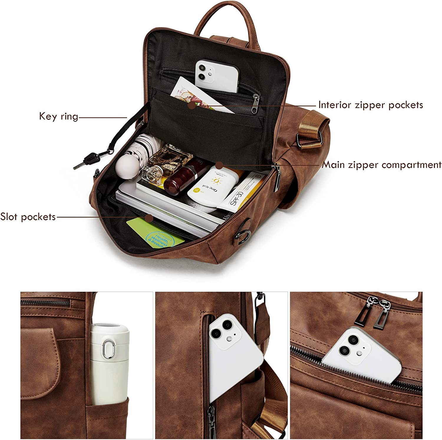 • 【LARGE CAPACITY】This leather backpack purse for women adopts a large vertical opening at the top, which is very convenient for loading items. 1 inner zipper pockets, 2 inner slot pockets, 2 front pockets, 2 side pockets, and 1 back zipper pocket. The extra wristlet provides more compartments. Multiple pockets can keep your things well organized.