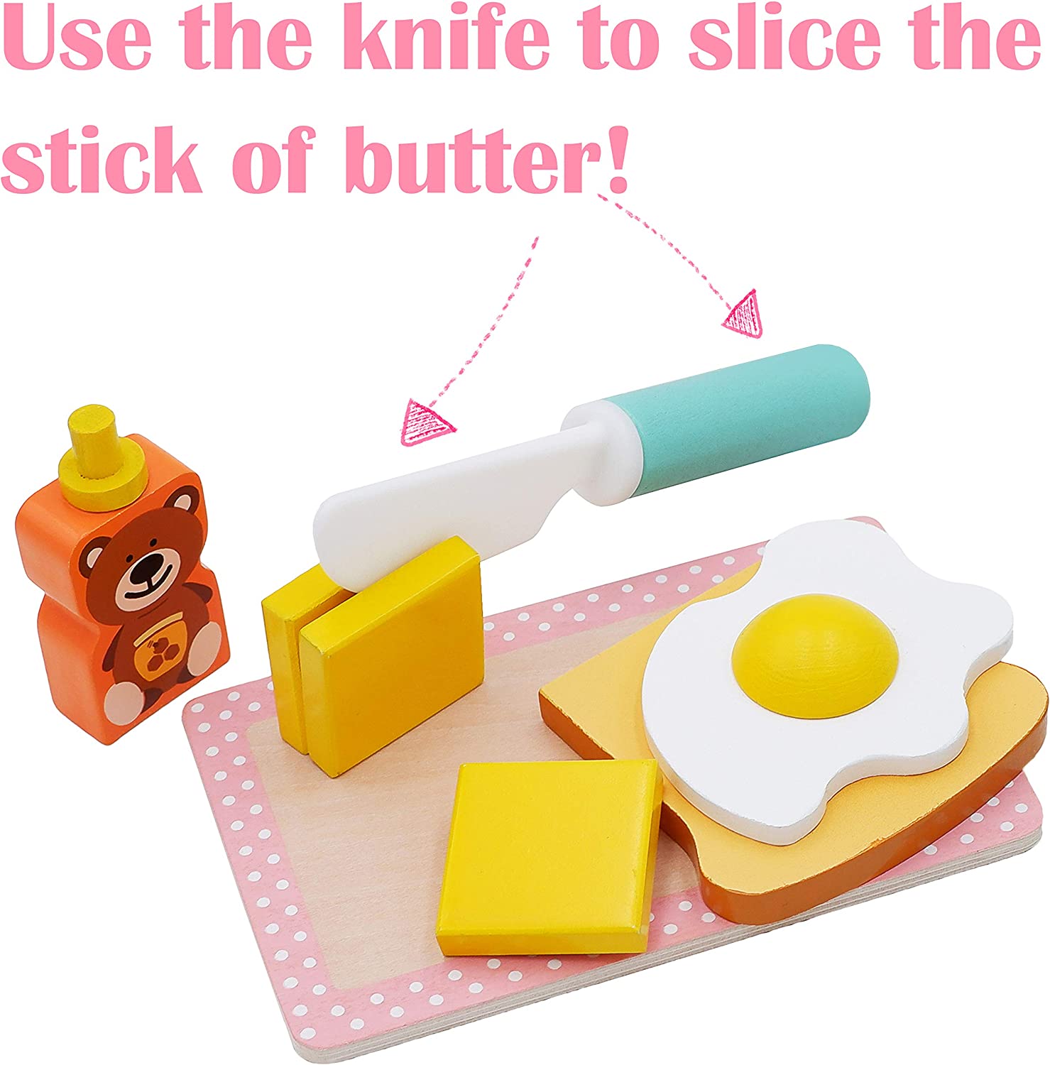 • ?Interactive Toy Pop-Up Toaster for Kids – This Pop-Up Toaster toy kitchen set contains premium wooden Toaster with an exclusive designed chopping board, 3 slices of butter and 2 slices of bread, knife, poached egg and a bottle of honey bear. With all of this kitchen tools and food, kids are able to cook their own breakfast. Plus, if you already have the set of the Tiny Land Wooden Coffee Maker, then kids can start off their morning the with delicious toast together with a cup of coffee!