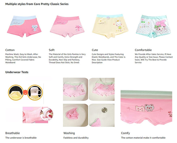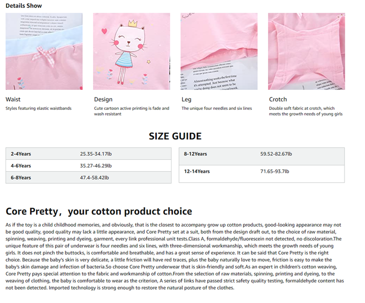 • The quality control is up to grade A. The material of the girls panties is very soft and comfy, extra strength and durability, non-slip and painless, thread does not stick, no smell