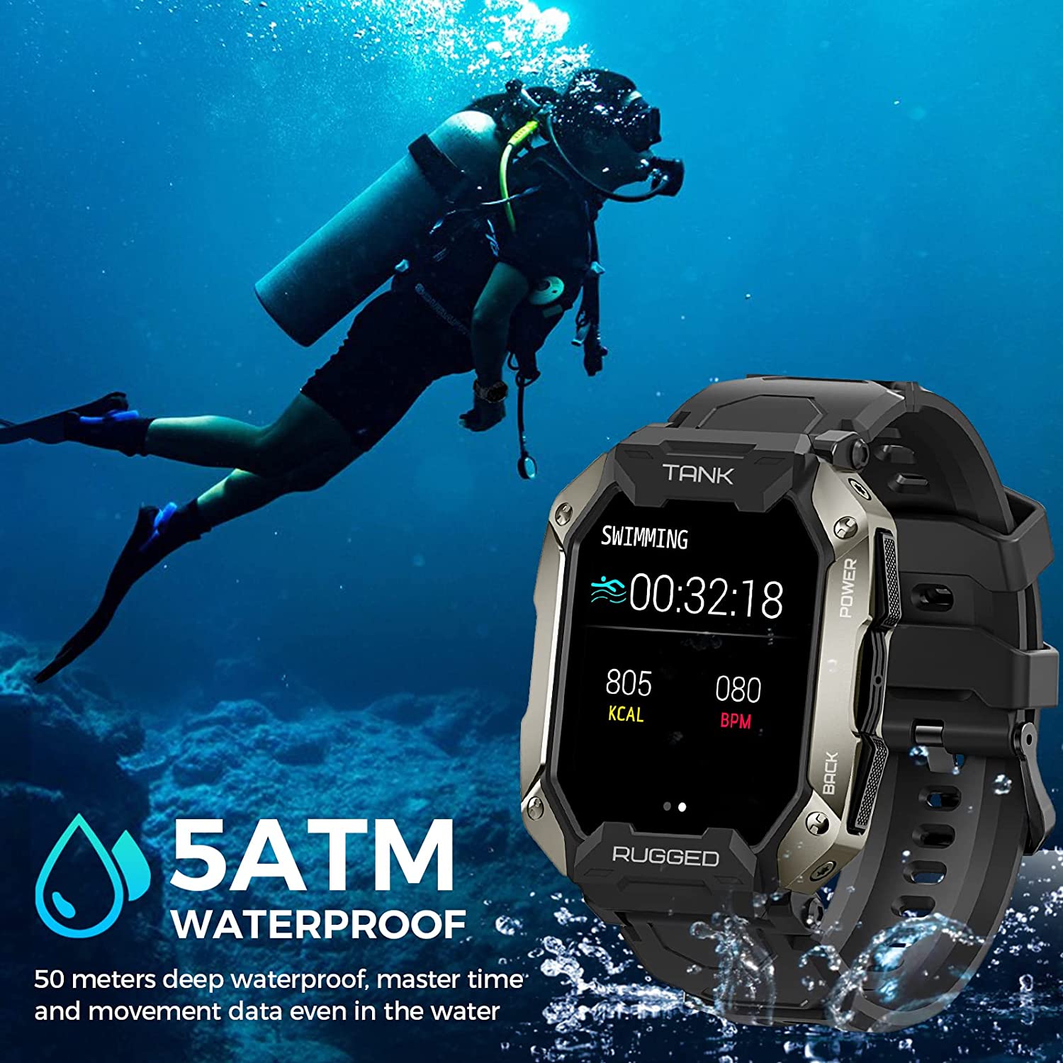 • ✅Extremely Resistant to Damage - Fully enclosed slim shell designed android smart watch can be immersed in 50m (5ATM waterproof) deep water. Our military watch is a proven survivor of extreme conditions and has passed the drilling, crushing and hot steam scouring test which makes sports watch suitable to be used in high temperature and high pressure environments