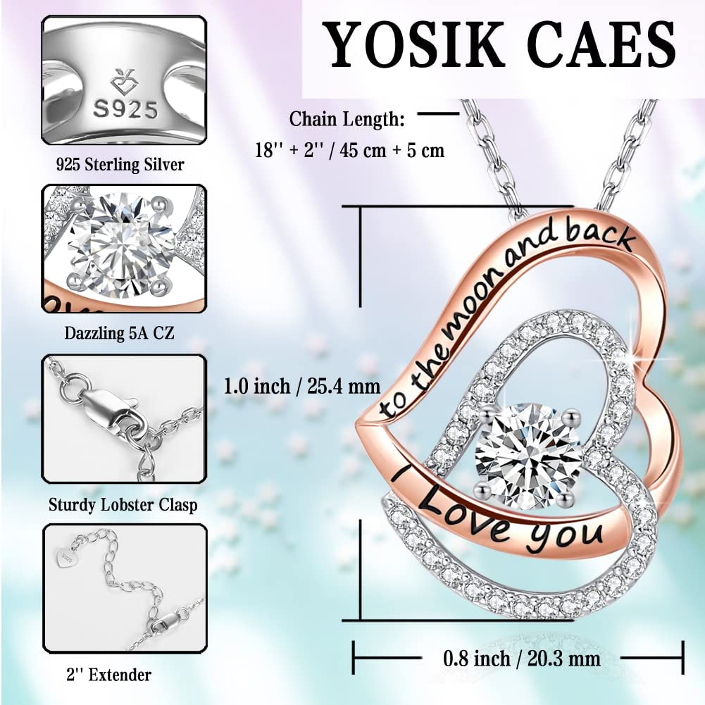 YosikCaes 925 Sterling Silver Double Heart Birthstone Pendant Necklace for Women, 18K Rose Gold Plated, Hand Set with 5A Zirconia Stones, 18+2" Chain Length, 10mm Lobster Claw Clasp with Jewelry Polis