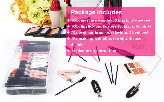Value set: You will receive 50 pieces rose red and 50 pieces black mascara wands, 50 pieces black and 50 pieces pink lipstick applicators, 35 pieces white and 35 pieces yellow disposable eyeliner brushes, 12 pieces black, white and pink hair Clips and 1 piece plastic organizer box,a total of 283 pieces, sufficient quantity and various colors,good for your daily makeup or sample the lipstick or mascara for clients in cosmetic counter