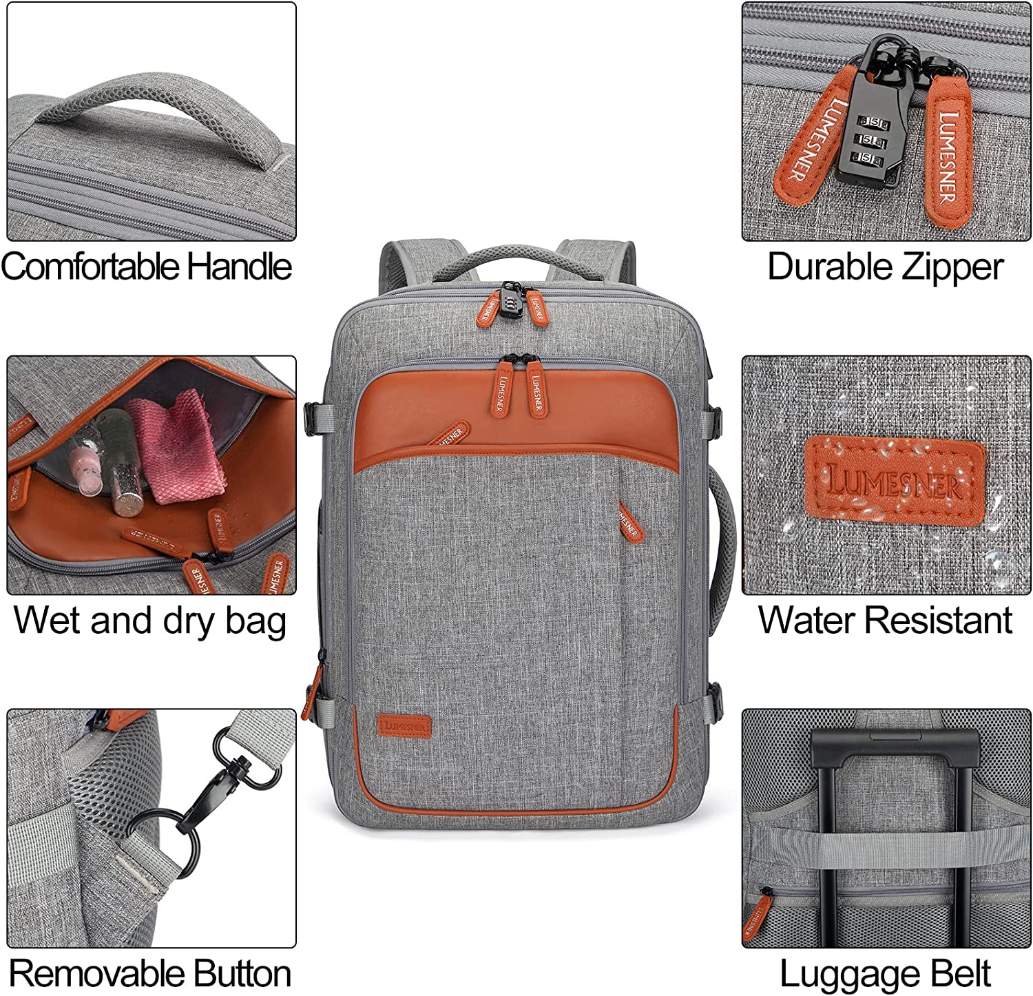 ?LARGE CAPACITY & EXPANDABLE:This extra large travel backpack with expandable feature offers you more packing capacity up to 40L.Unzipping to get larger storage space then can easily hold packing cubes, make-up bag, outfits, camera bag and gear for 3~7 days of travel.The carry on backpack fits overhead and under seat while on state of standard carry on size, is ideal for men, women, weekend traveler, or occasional vacationer.
