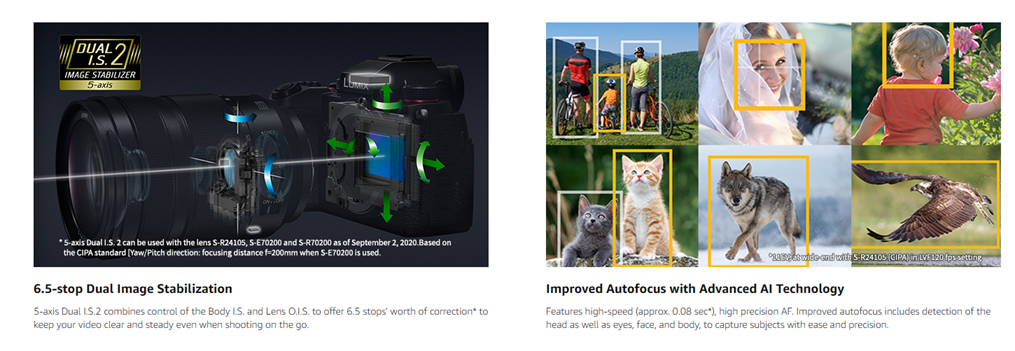 • IMPROVED, HIGH-PRECISION AUTOFOCUS AND POWERFUL IMAGE STABILIZATION: Improved autofocus includes detection of the head as well as eyes, face and body, to capture subjects with ease and precision. 5-axis Dual I.S. 2 enables 6.5-stop slower shutter speed.