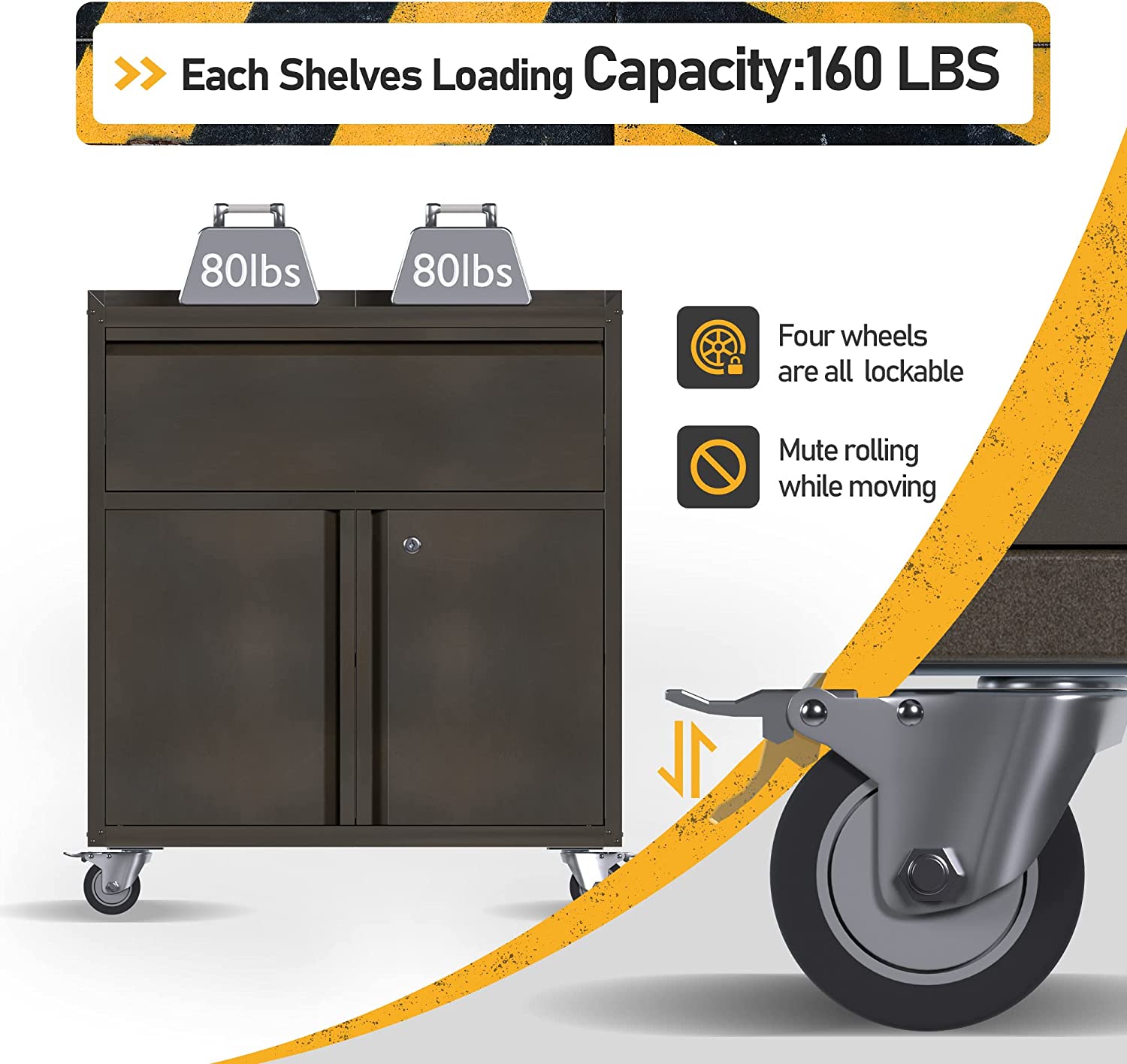 【360° Caster Wheels】The rolling storage cabinet is installed with four wheels at the bottom, which can rotate in 360° direction, so you can easily move the heavy duty storage cabinet in any direction. Each wheel has a lock, and the wheels can be fixed after the cabinet is moved to the right position to prevent movement.