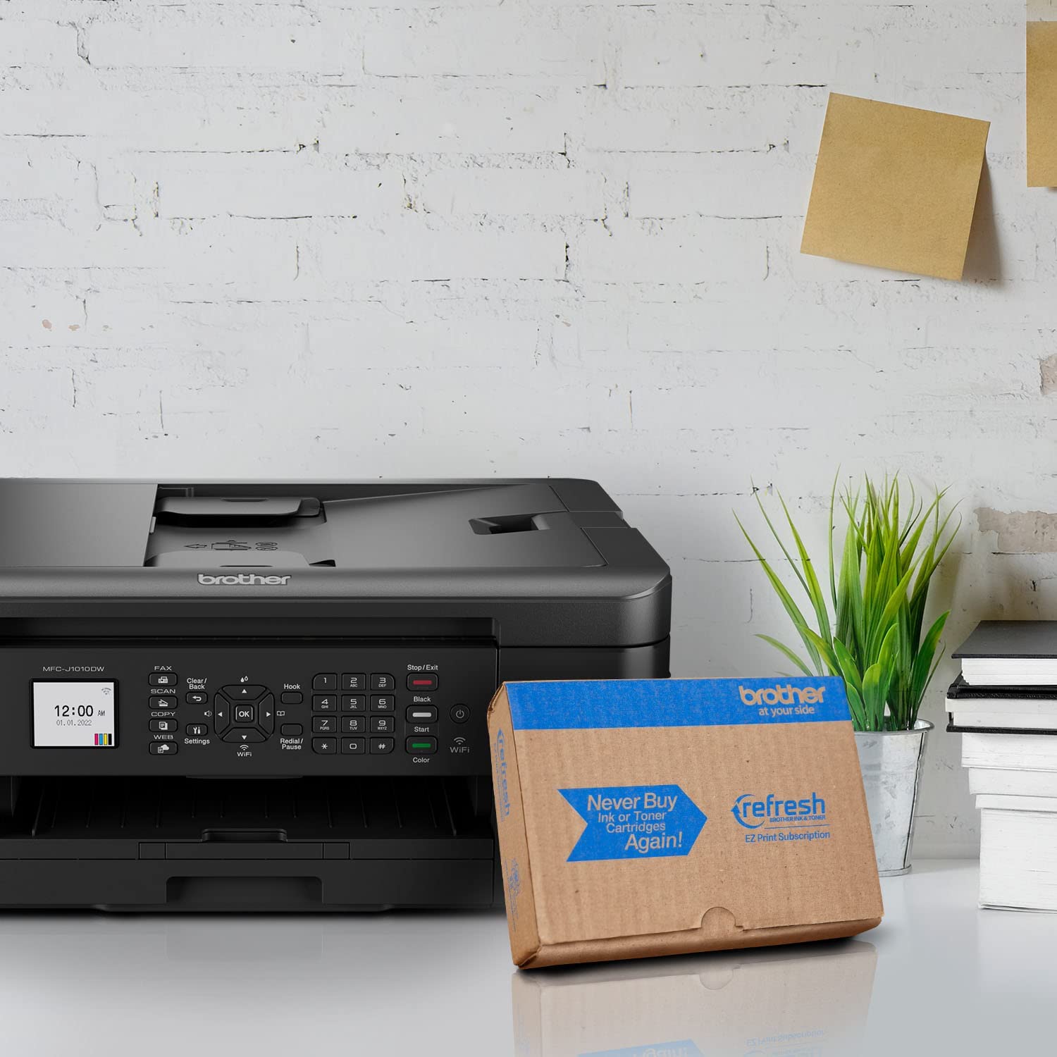 The Brother MFC-J1010DW color inkjet all-in-one printer is ideal for your home, home office or small office. Delivers robust features and business-centric functionality not found in similarly priced inkjet printers plus print up to 17 ppm for black and 9.5 ppm for color(5). Compact and economical, perfect for small spaces and budgets. Includes multiple connection options, including a built-in wireless(3) interface for sharing with multiple network users, Wi-Fi Direct(R), or connect locally via a USB interface. Delivering high quality, reliable printing, copying, scanning and faxing and enabling wireless printing from your desktop, laptop, smartphone or tablet(3). Use the 1.8-inch color display to navigate on screen menus. Featuring the Brother Mobile Connect(1) App, that gives you the freedom to print and manage your printer from virtually anywhere. The MFC-J1010DW also features the unique Brother Page Gauge(2) that estimates remaining page levels, so you always know how much ink you have left. Use the 20-page capacity automatic document feeder or the 150-sheet capacity adjustable paper tray for generous output without constant monitoring. Duplex printing helps save paper, while mobile device printing(3) and Cloud connectivity let you print-from and scan-to popular Cloud services(4) directly from the device. Has a 1-year limited warranty and free online, call, or live chat support for the life of the printer. Works with Alexa.(1) Requires wireless network connection; Brother Mobile Connect free app download not available in all countries.(2) Page Gauge is an estimate for informational purposes only. For actual cartridge yield information refer to manufacturer’s website.(3) Requires wireless network connection.(4) Requires Internet connection and account with desired service.(5) Based on ISO/IEC 24734 (after first set of ISO test pages). For inkjet print speed methodology, please visit manufacturer’s website.(6) All page yields are approximate and are calculated in accordance with ISO/IEC 24711; for additional page yield info, see manufacturer’s website.(7) Based on average monthly print volumes of approximately 100 pages at 60% black pages/40% color pages in accordance with ISO/IEC 24711 using 4 cartridges provided in-box. For additional page yield information, see manufacturer’s website.(8) Based on average monthly print volumes of approximately 150 pages at 60% black pages/40% color pages in accordance with ISO/IEC 24711 using 4 cartridges provided in-box. For additional page yield information, see manufacturer’s website.(9) Requires connection to a wireless network. AirPrint is a registered trademark of Apple Inc. Mopria® is a registered trademark or service mark of Mopria Alliance, Inc. in the United States and other countries. Unauthorized use is strictly prohibited. Wi-Fi Direct is a registered trademark of Wi-Fi Alliance®. Brother Mobile Connect and Brother iPrint&Scan free app download are not available in all countries.(10) The mobile device must have NFC capability and run Android OS 4.4 or later.Images are for illustrative purposes only. Specifications subject to change.