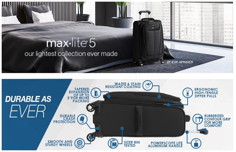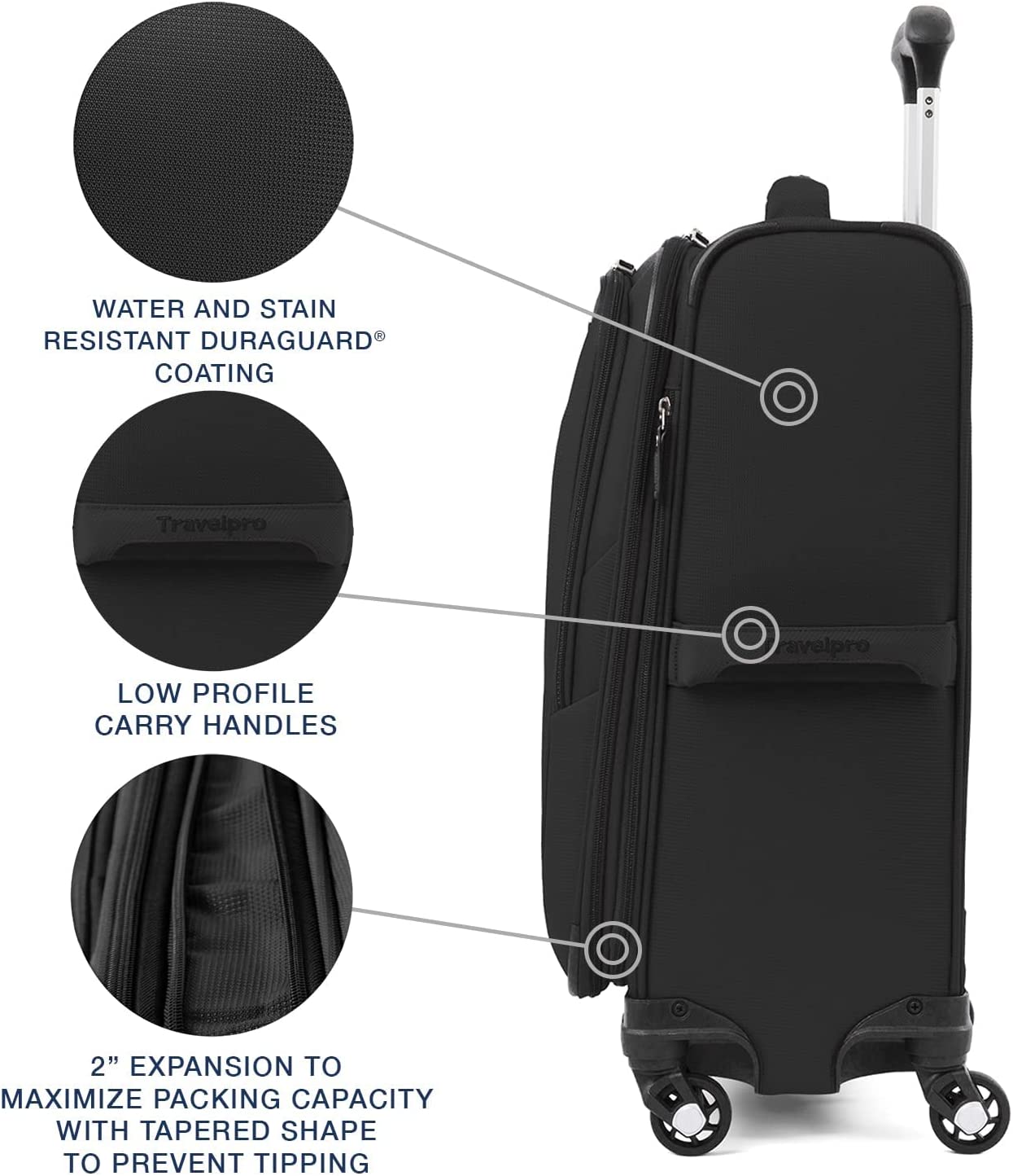 This carry-on soft-sided spinner is so light, it flies; one of our lightest wheeled carry-on suitcases, the Maxlite 5 21" expandable spinner is designed for ultimate comfort and mobility, featuring a 2-position adjustable PowerScope lite handle with patented Contour grip and 4-wheel 360 degree rotating spinners that glide effortlessly. Enjoy packing convenience with two quick-access, exterior front pockets, full-length interior lid pocket, side accessory pocket and adjustable hold-down straps, while the high-tensile-strength expandable zipper gives you maximum packing flexibility. Backed by a new and expanded trusted traveler promise-for worry-free warranty coverage from Travelpro.