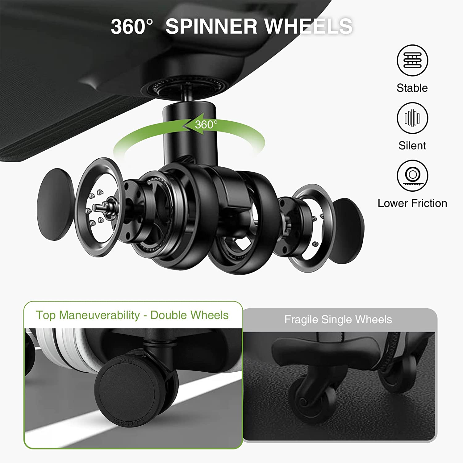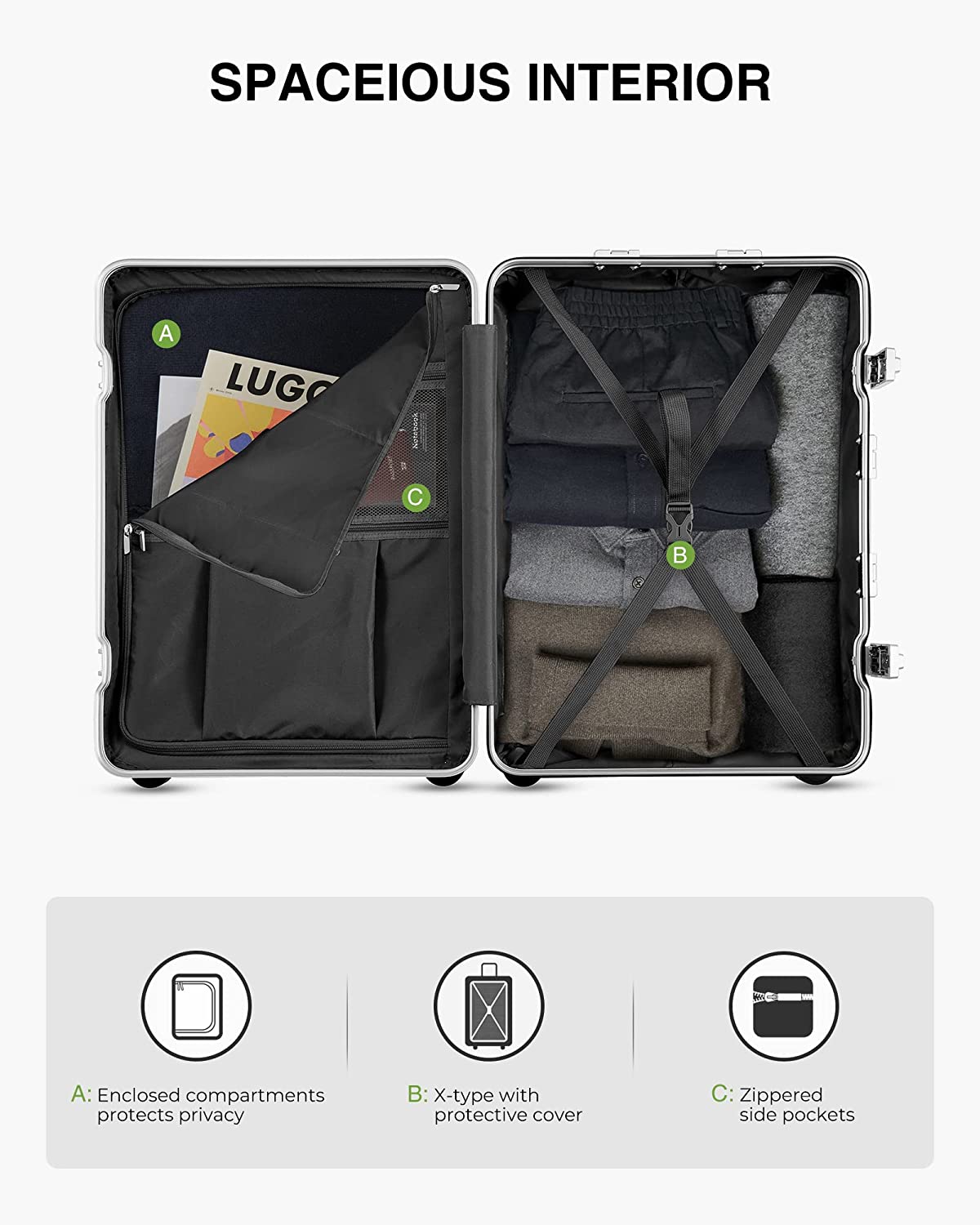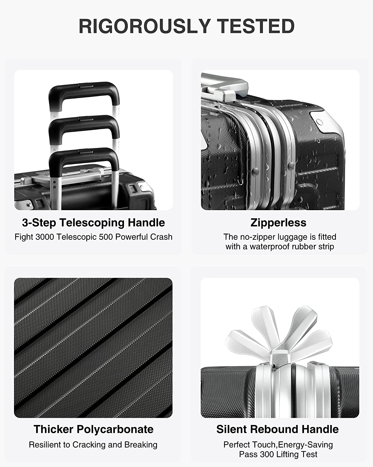 HIGH-END MATERIALS - This carry on luggage with spinner wheels is made of lightweight Polycarbonate uniting the resilient aluminum frame with no zipper design. Providing long-lasting and comfortable usage.